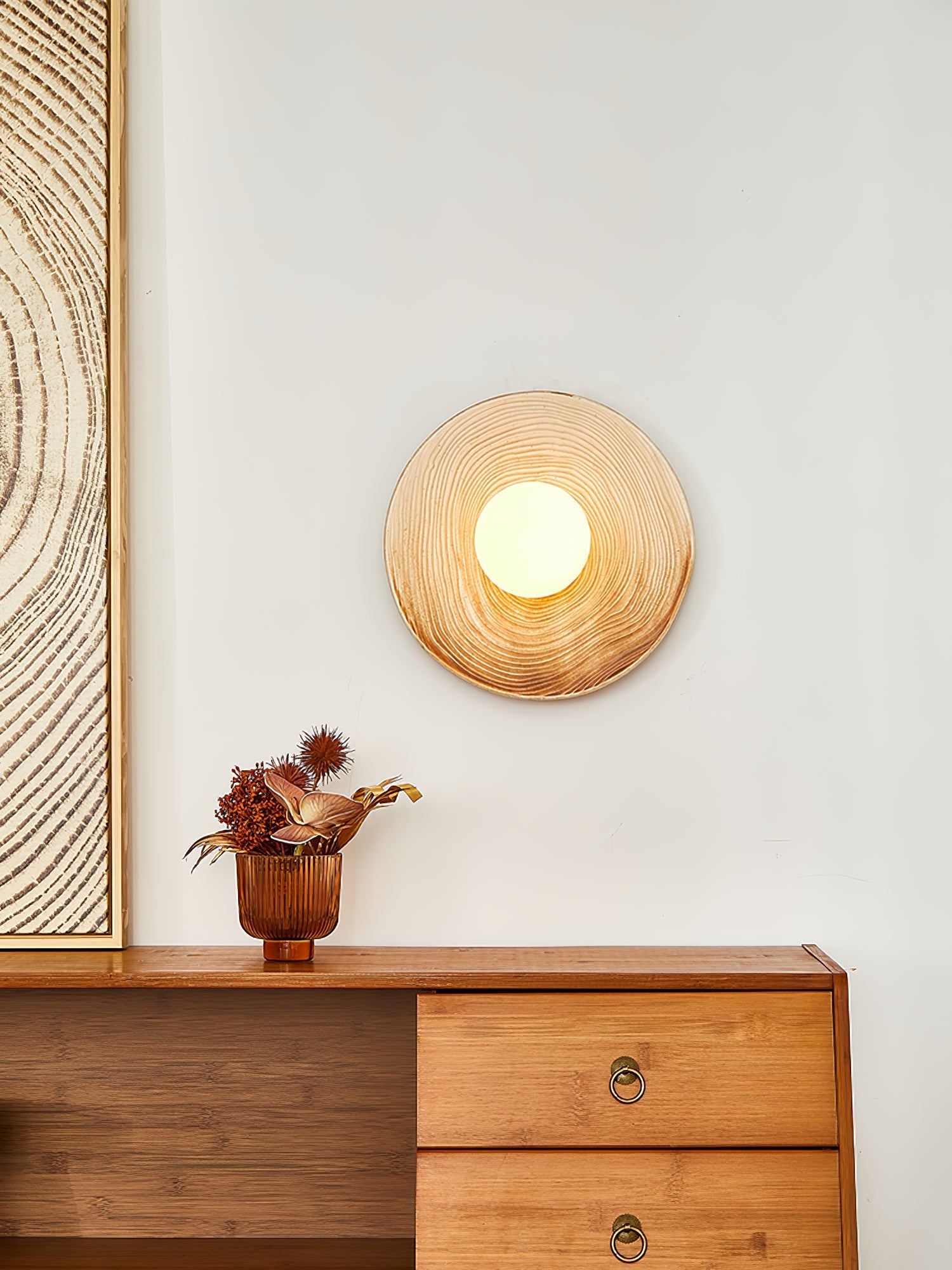 The Zelene wall lamp combines a ceramic disc base with a warm glowing glass sphere, echoing natural textures and organic forms. Its sculptural surface resembles concentric wood rings, adding depth and character to any wall. Ideal for bedrooms, living areas, or hallways, this sconce delivers both ambient light and decorative charm.