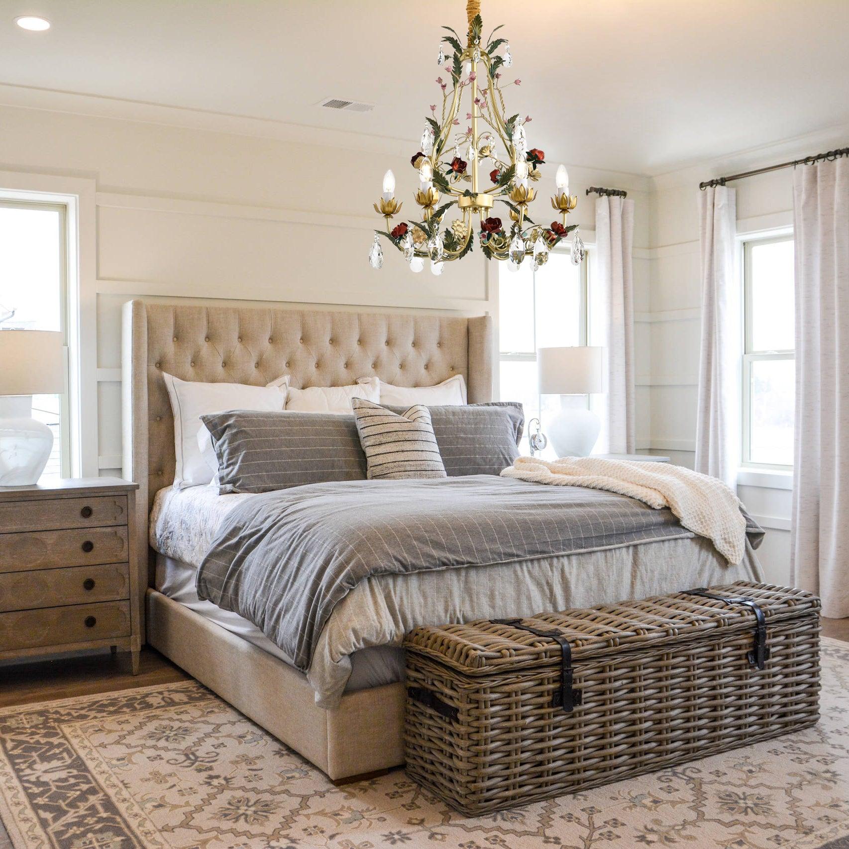 This chandelier showcases a captivating blend of nature-inspired elements and luxurious craftsmanship. The framework, adorned with delicate gold-colored leaves and blooming roses, intertwines with clear crystal droplets that refract light beautifully. The ornate form, complemented by candle-like bulbs, exudes both elegance and whimsy, making it a statement piece suitable for various interior styles. Whether it's for a classic living room or a romantic bedroom, this chandelier promises to add a touch of opulence and charm to any space.