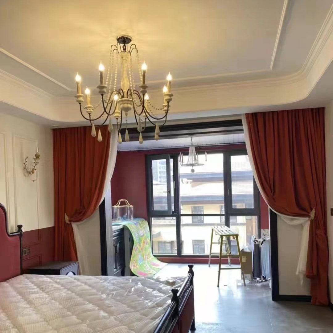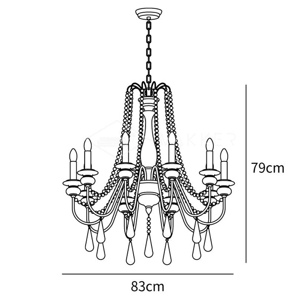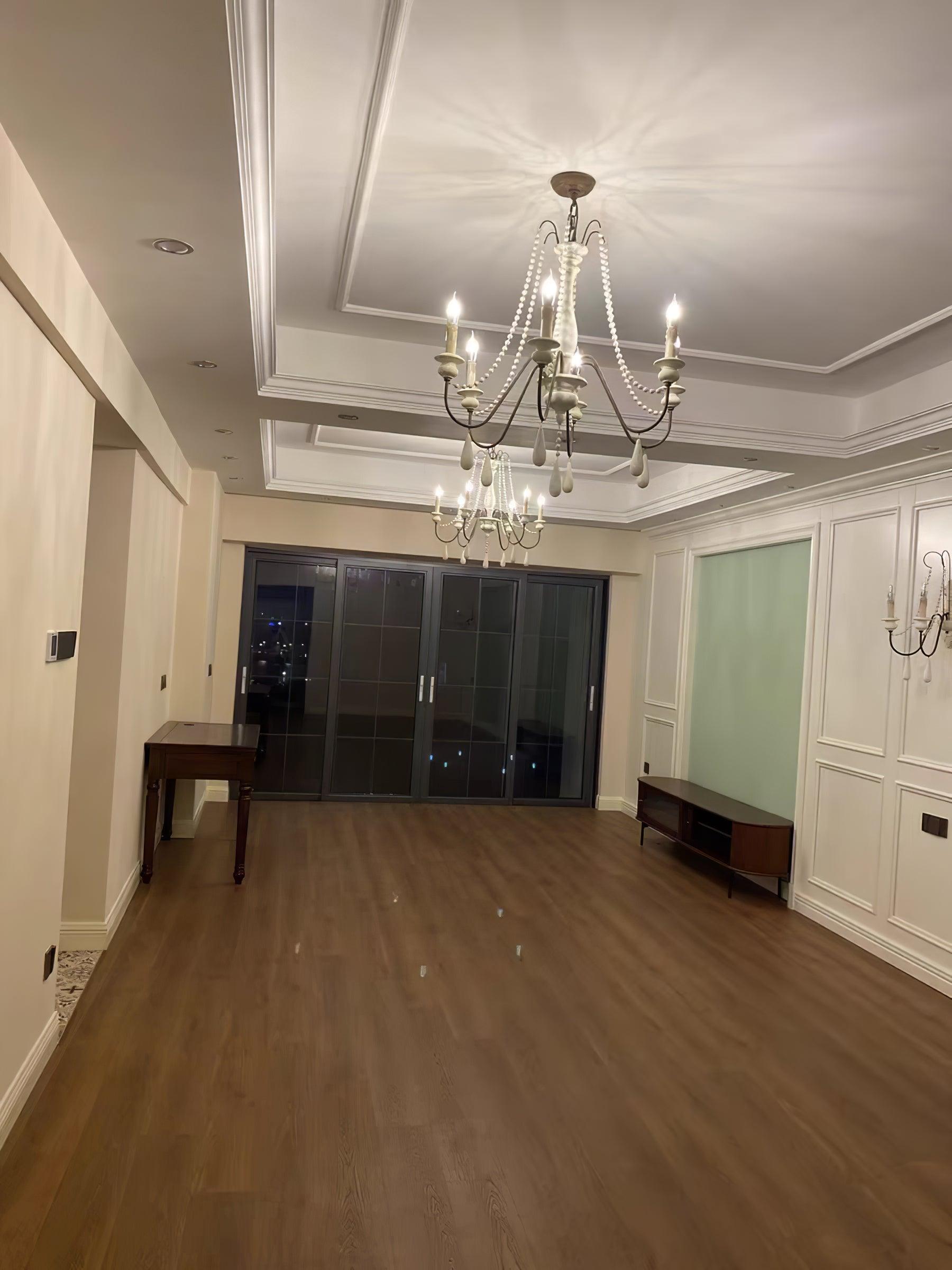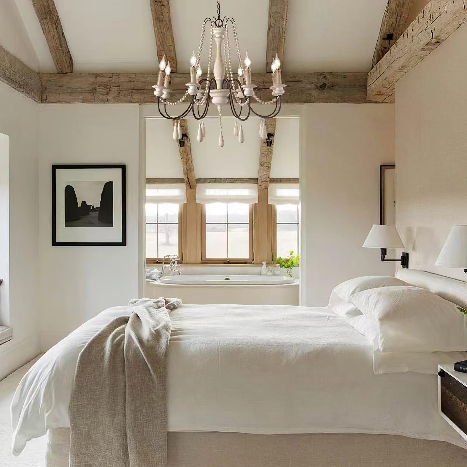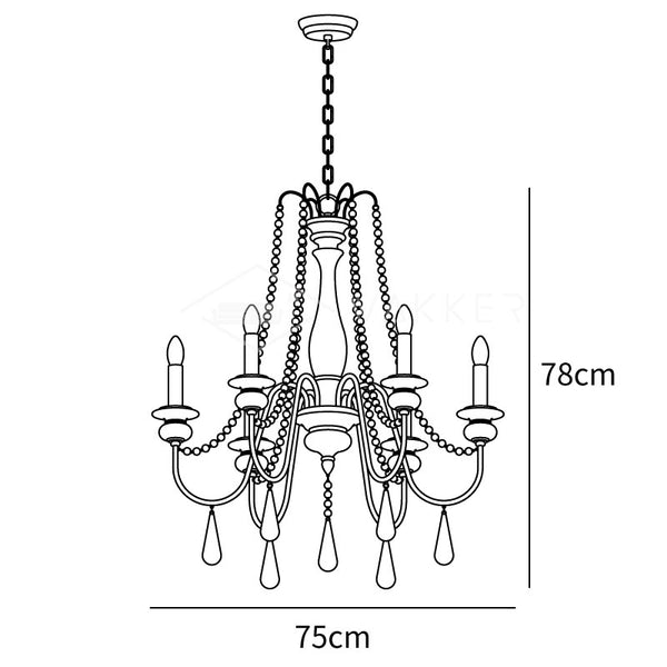This chandelier showcases graceful wooden beads draped across scrolling arms with candle-style bulbs. Dangling teardrop ornaments echo the vintage motif, while rusted metal contrasts with a distressed white finish for a soft, rustic charm. Perfect for classic and feminine interiors.