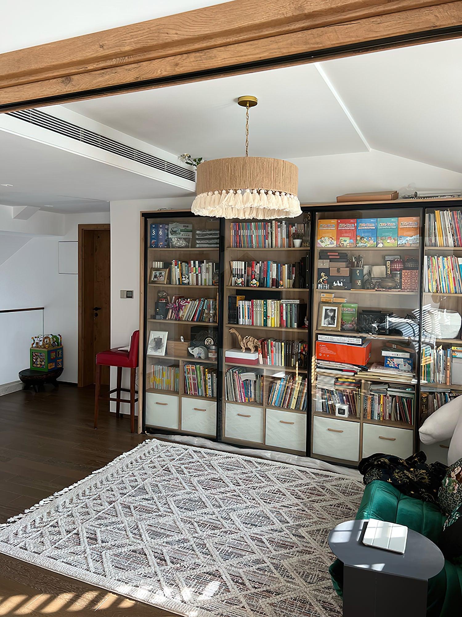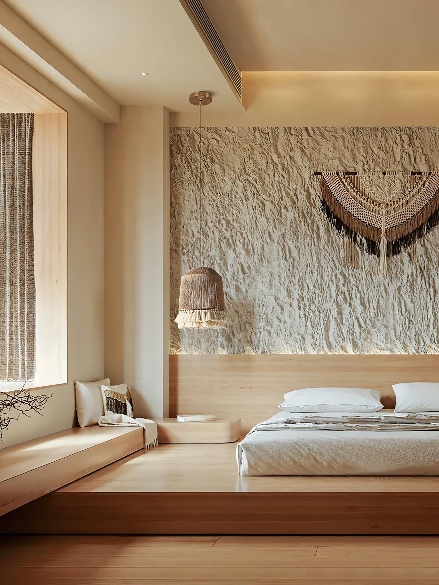 The Lustra Pendant Lamp features hand-woven cotton gauze with elegant tassels, bringing a touch of Bohemian style and sophistication to your living or bedroom space.