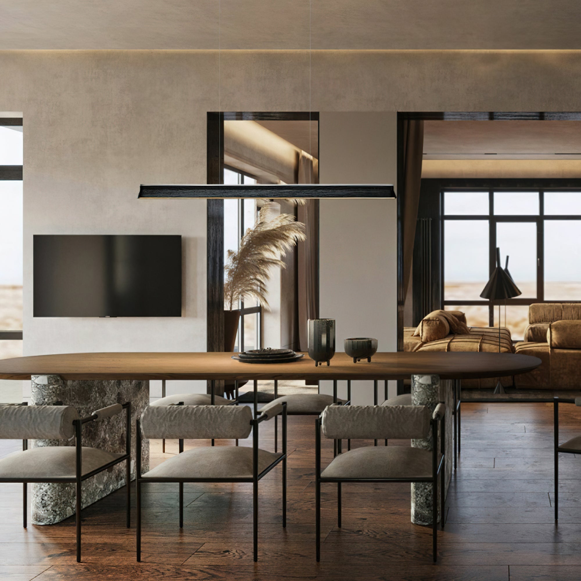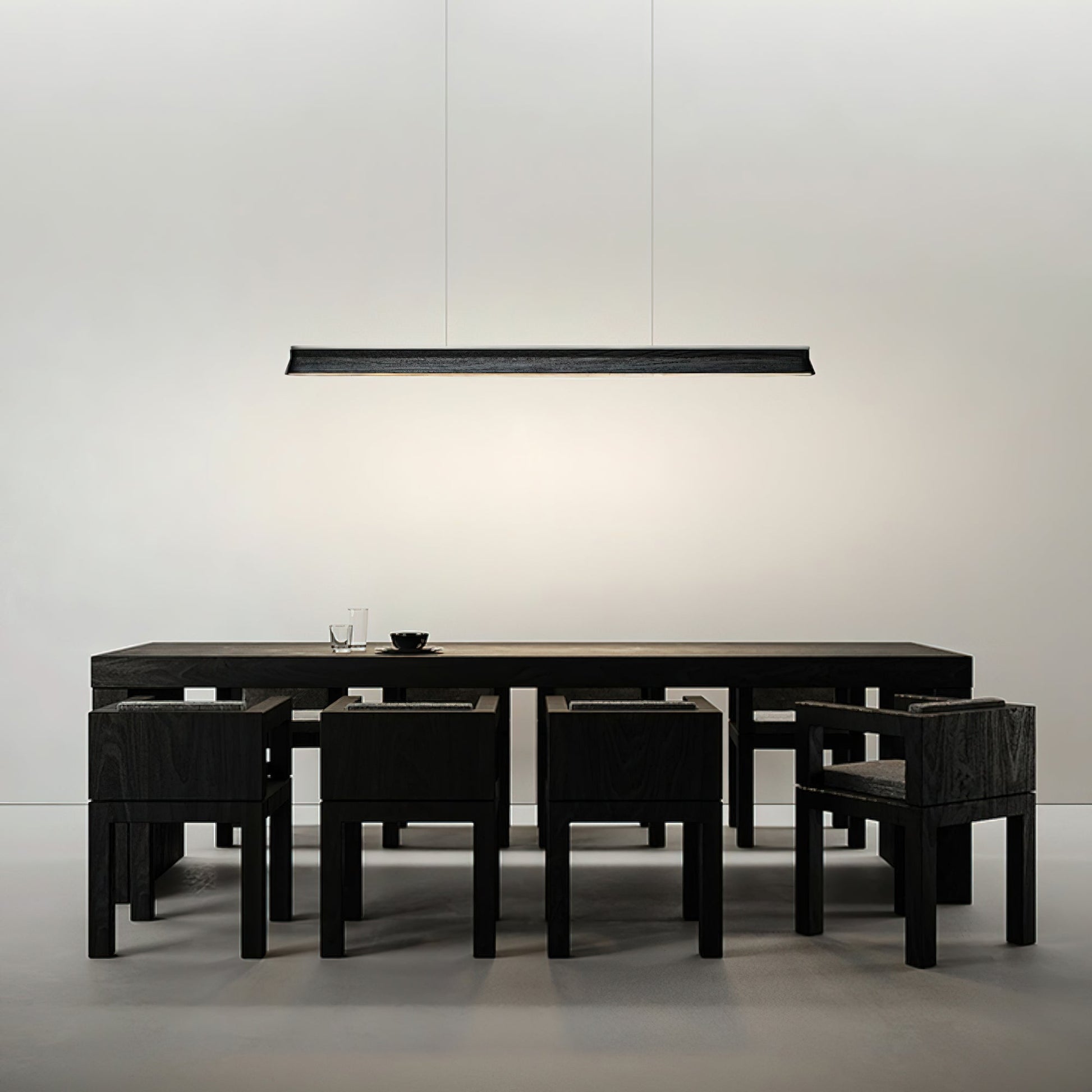 The Chandelier features a sleek wooden beam with a minimalist design, offering a warm, elegant atmosphere. Ideal for dining areas, kitchens, or offices, this pendant light creates a floating effect while providing soft, diffused light for a stylish and comfortable space.