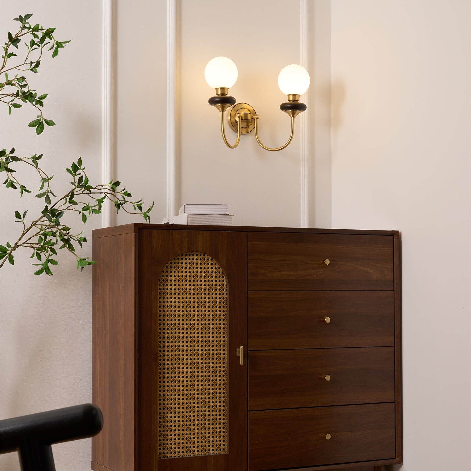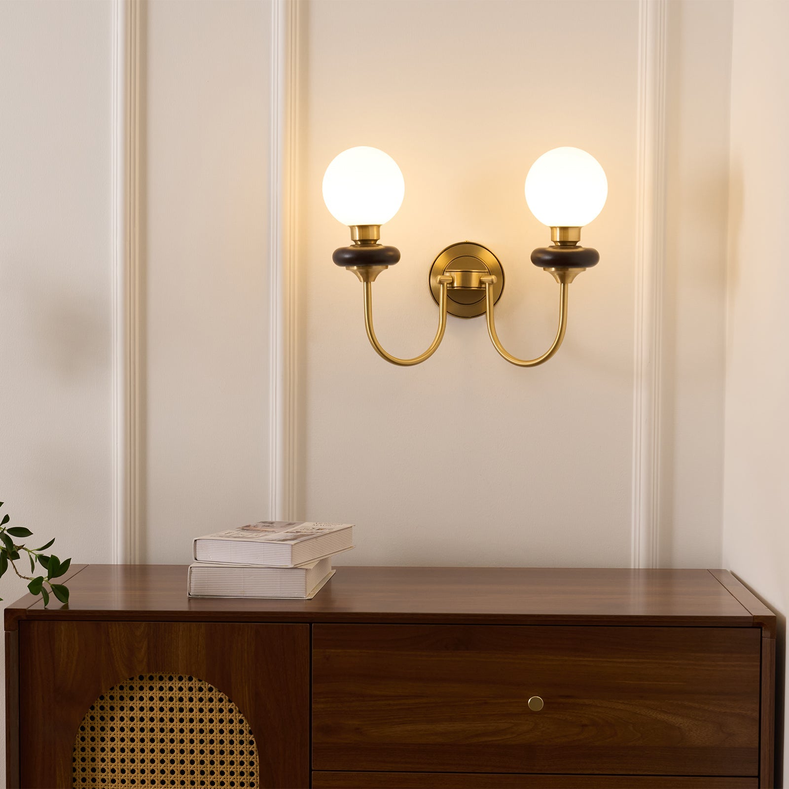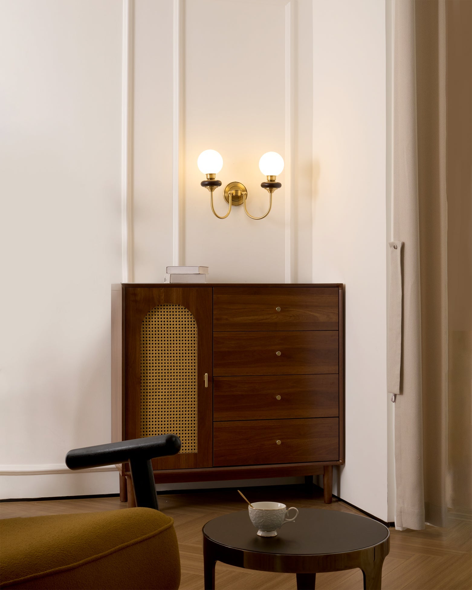 The Perry wall lamp combines warm walnut accents with frosted glass globes and a refined brass frame. Its dual-light design provides balanced illumination, making it ideal for bedrooms, hallways, or dining spaces. The curved arms soften the structure while the glowing spheres bring a welcoming ambience. A versatile piece that works equally well in Nordic, mid-century, or contemporary interiors.