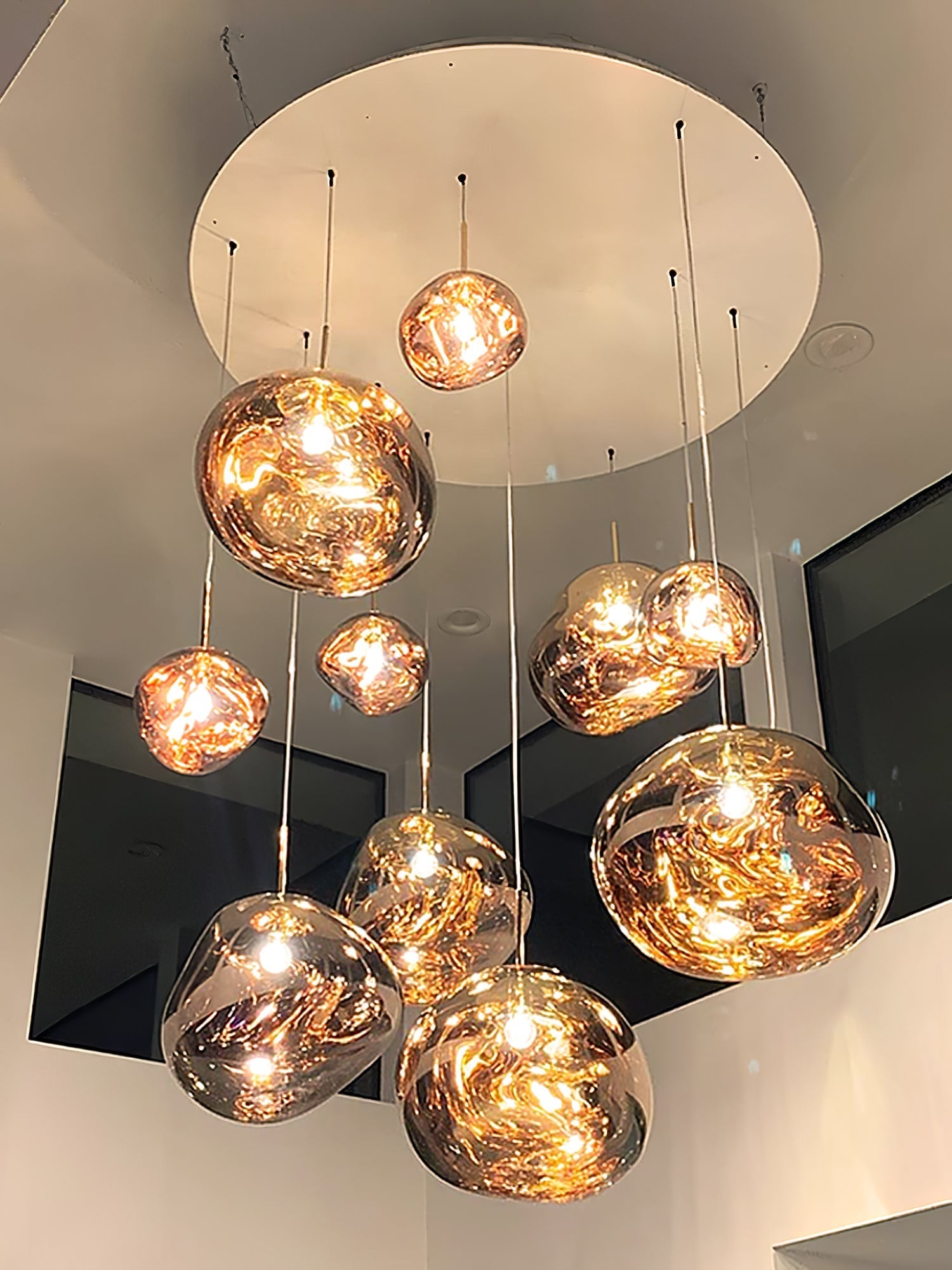 Each light is a bold statement on its own, but these pendant lights often work best in groups. Infinite reflections, spatial play, and visual arrangements highlight the extraordinary character of the collection. This series features suspension systems from best-selling collections, each unique and easy to install with a round ceiling canopy. Emitting an attractive, mildly hallucinogenic glow, the pendant creates a mesmerizing melting hot-blown glass effect when on and a mirror finish when off.