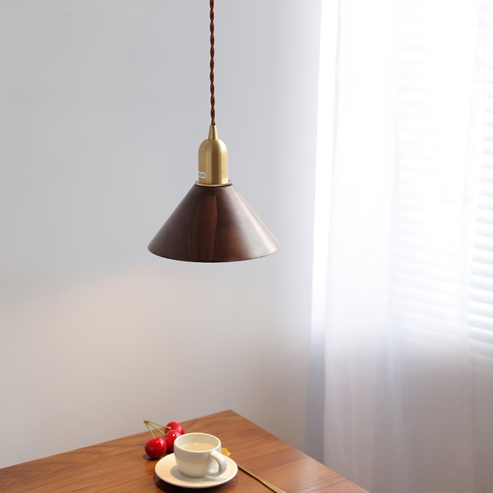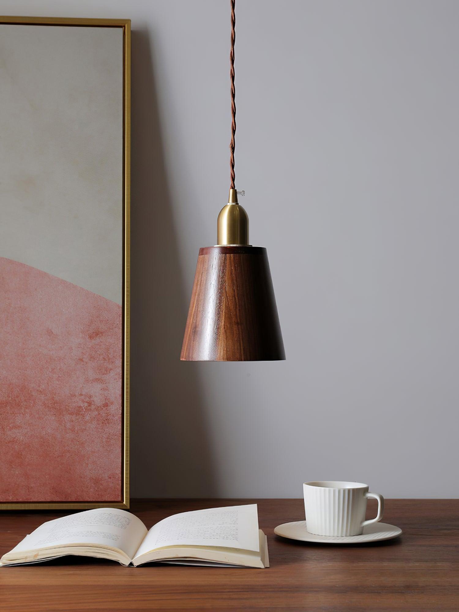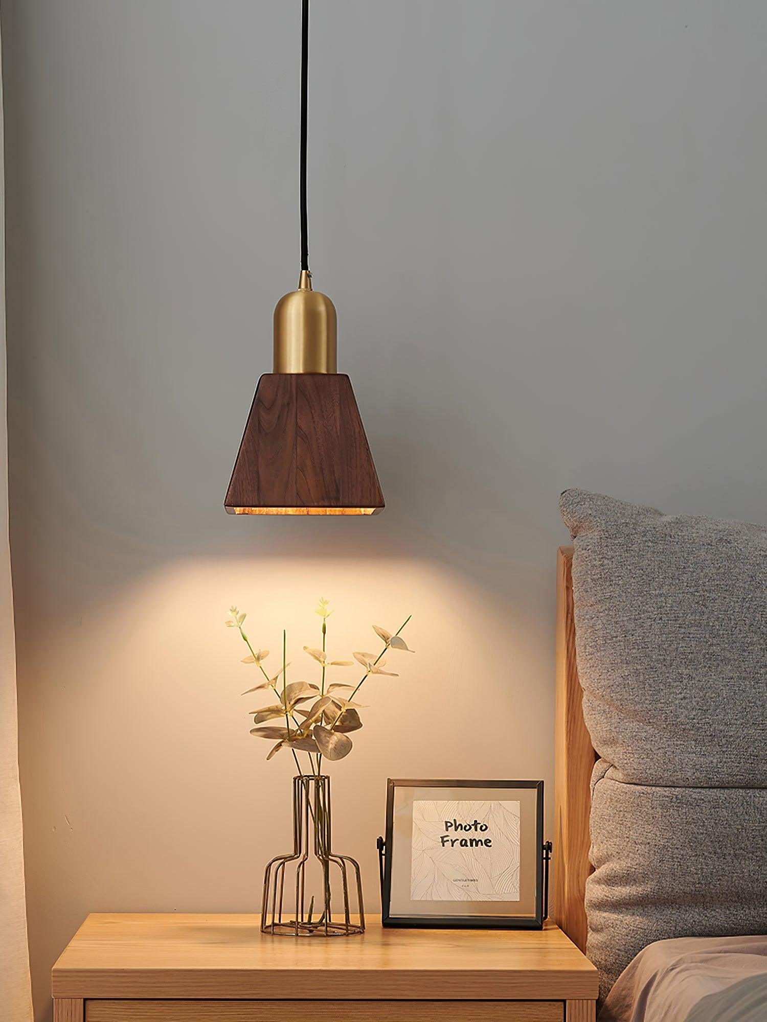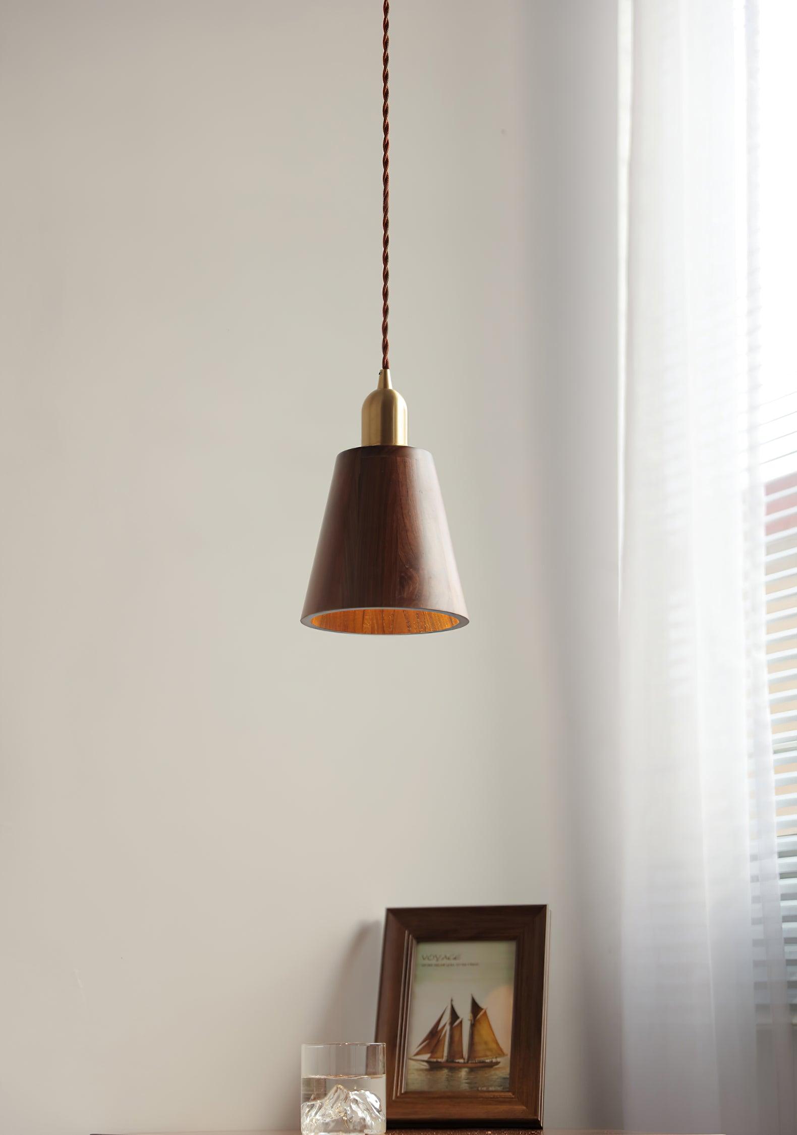 The Lustra Pendant Lamp combines walnut wood and brass for a timeless, modern design. Its sophisticated style adds warmth and elegance to living or dining room spaces, creating a refined atmosphere.