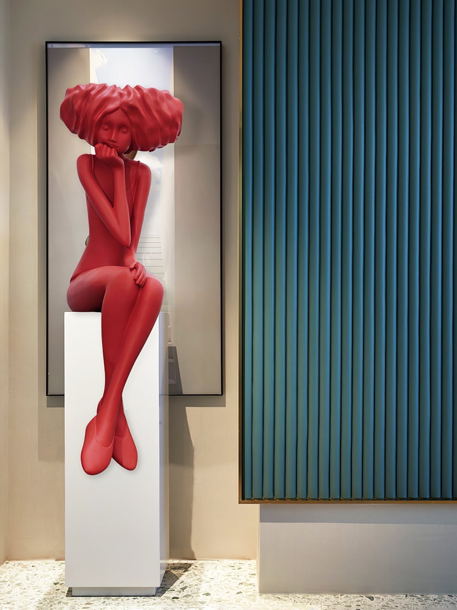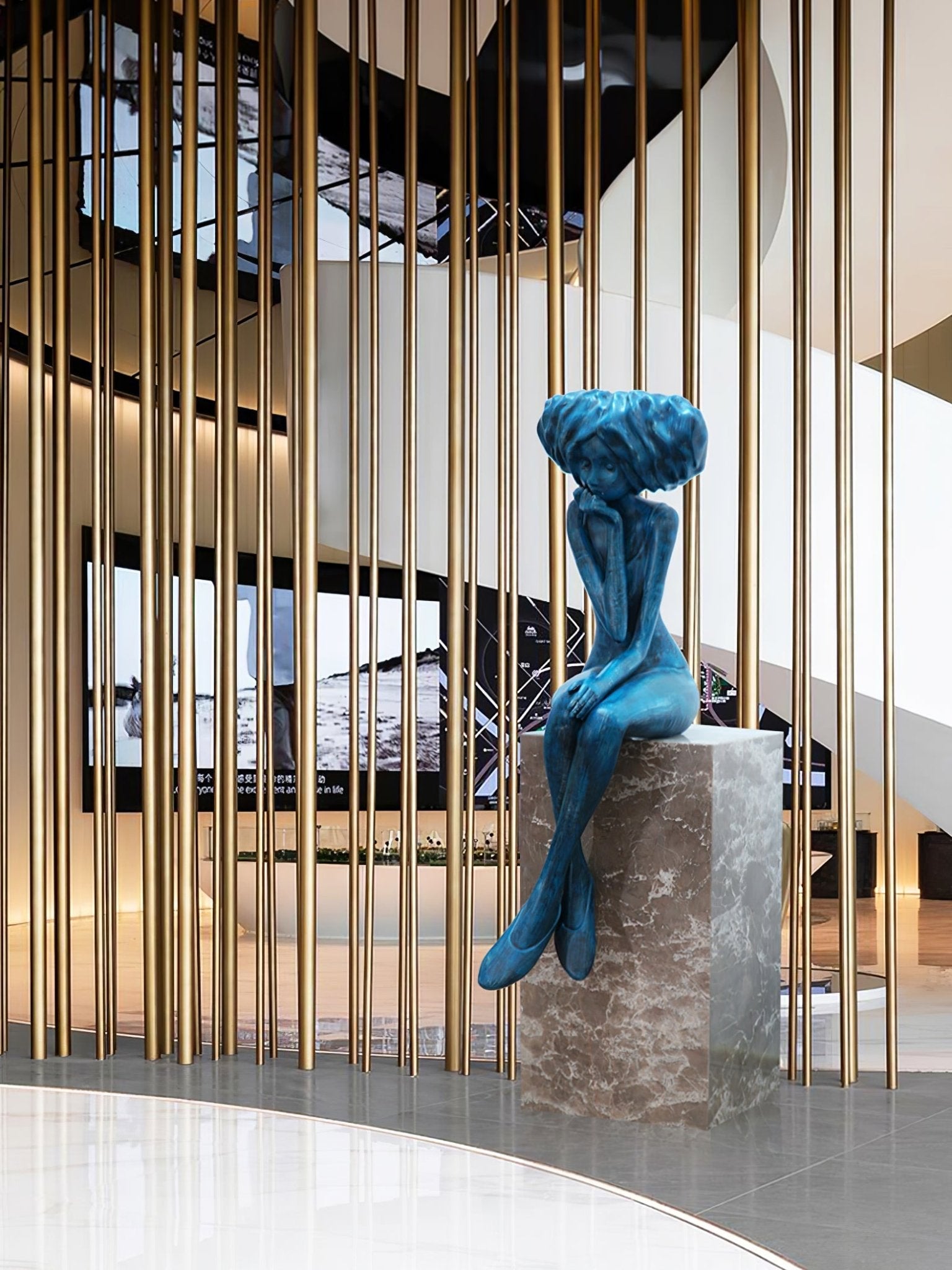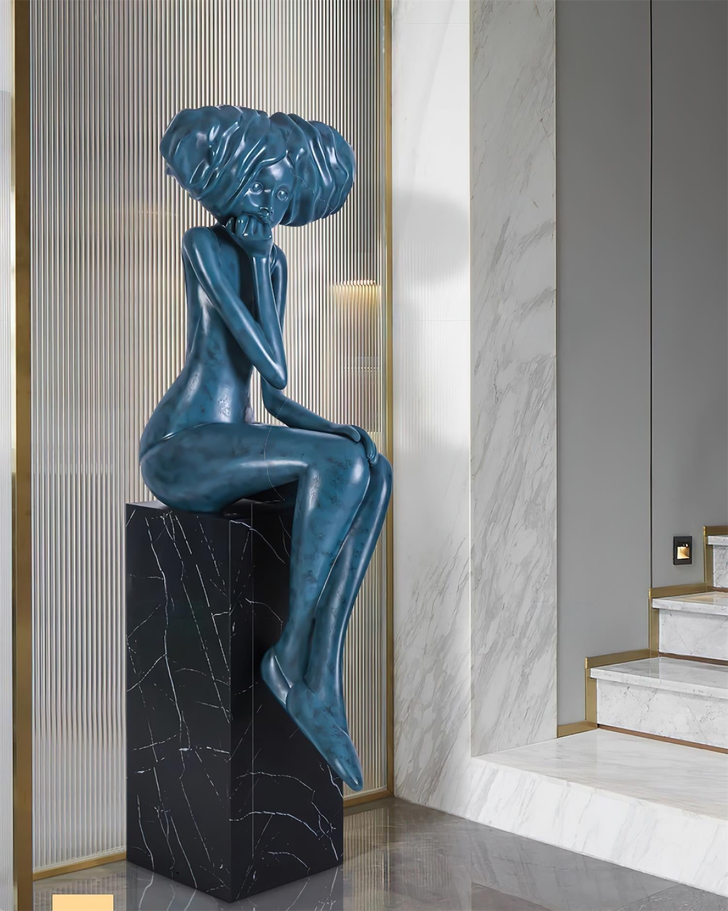 This girl meditate sculpture features a vibrant blue figurine seated in a thoughtful pose atop a marble-style base. Its expressive form brings elegance and tranquility to living spaces, blending art with serene atmosphere.