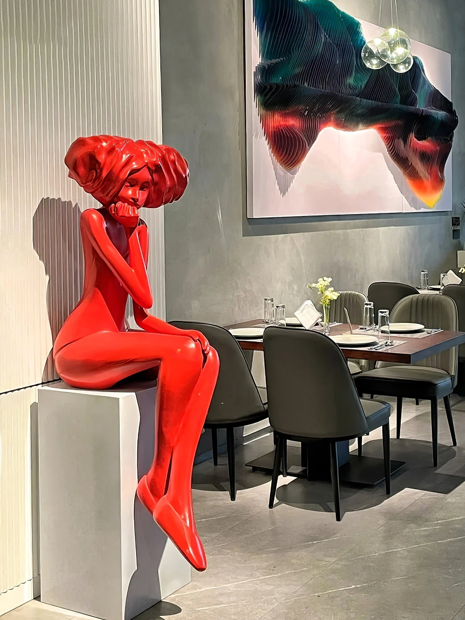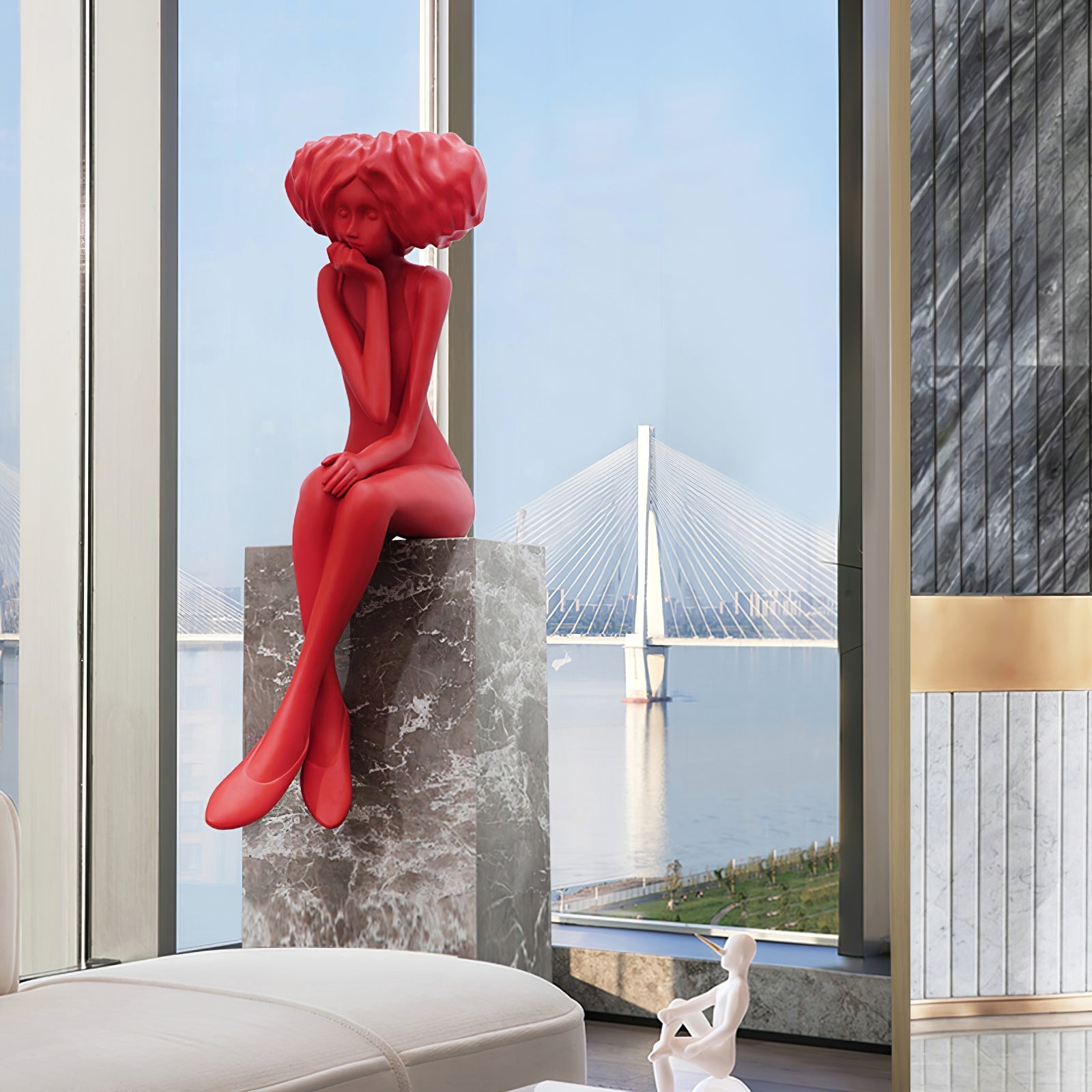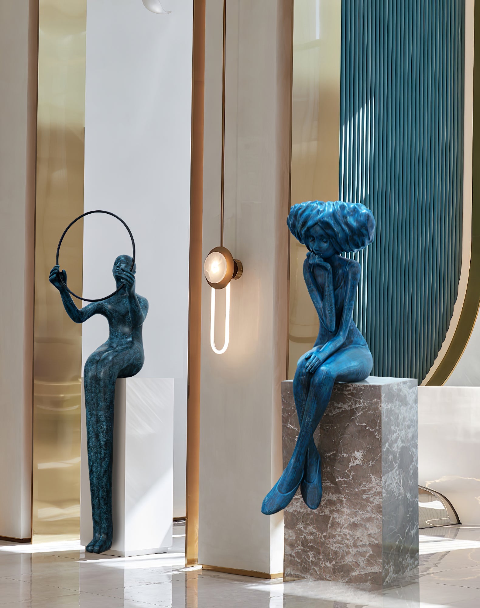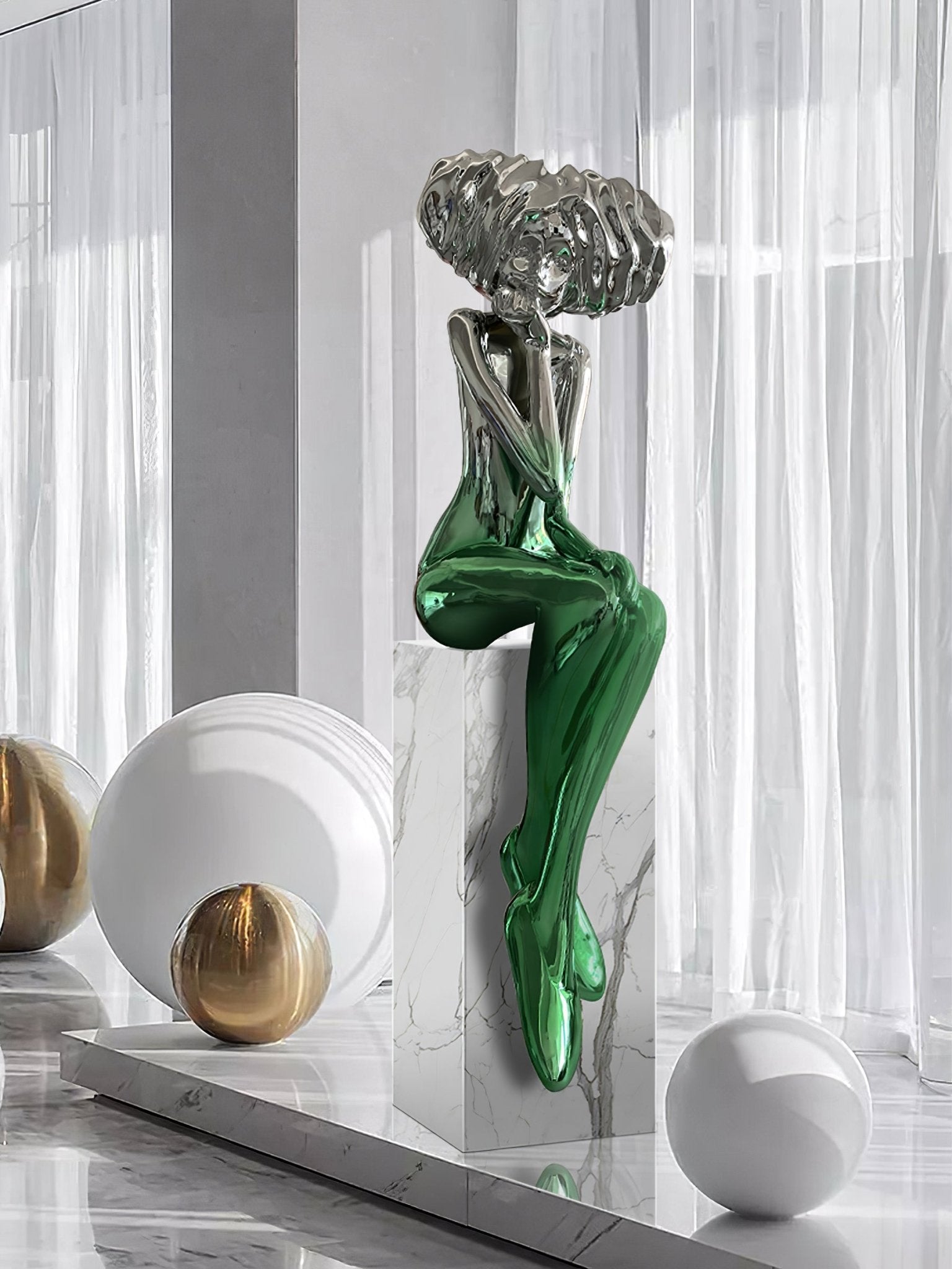 This girl meditate sculpture features a vibrant blue figurine seated in a thoughtful pose atop a marble-style base. Its expressive form brings elegance and tranquility to living spaces, blending art with serene atmosphere.
