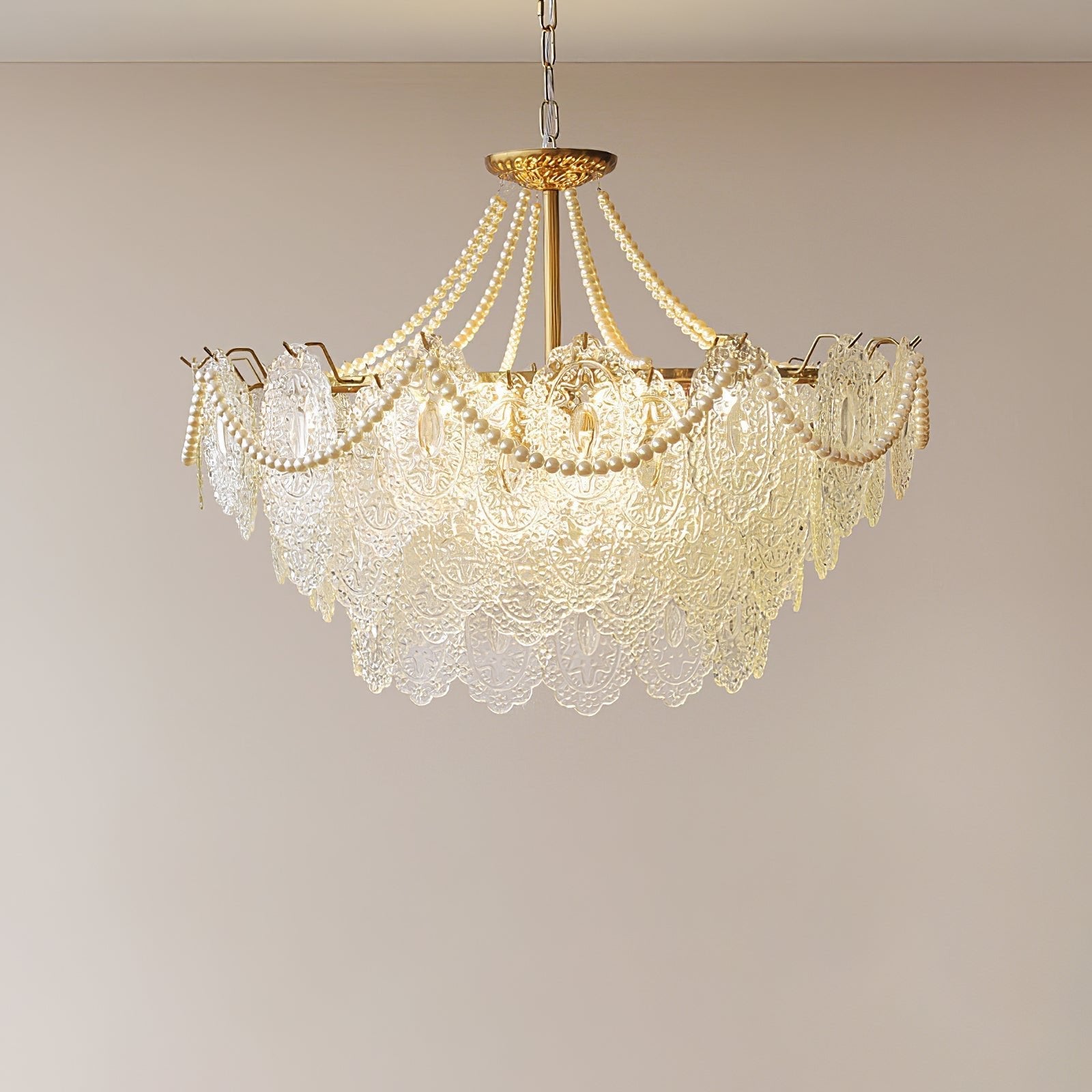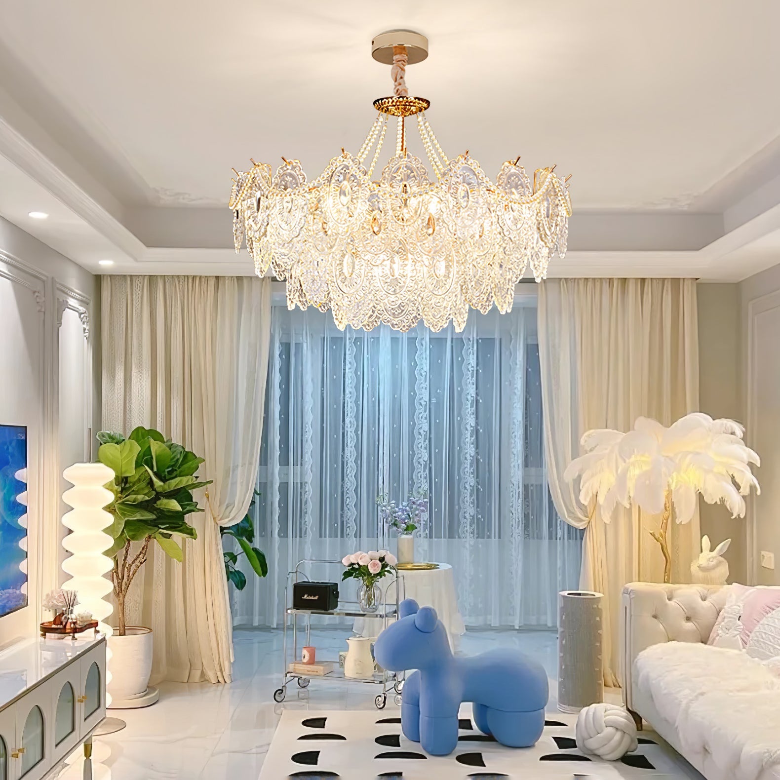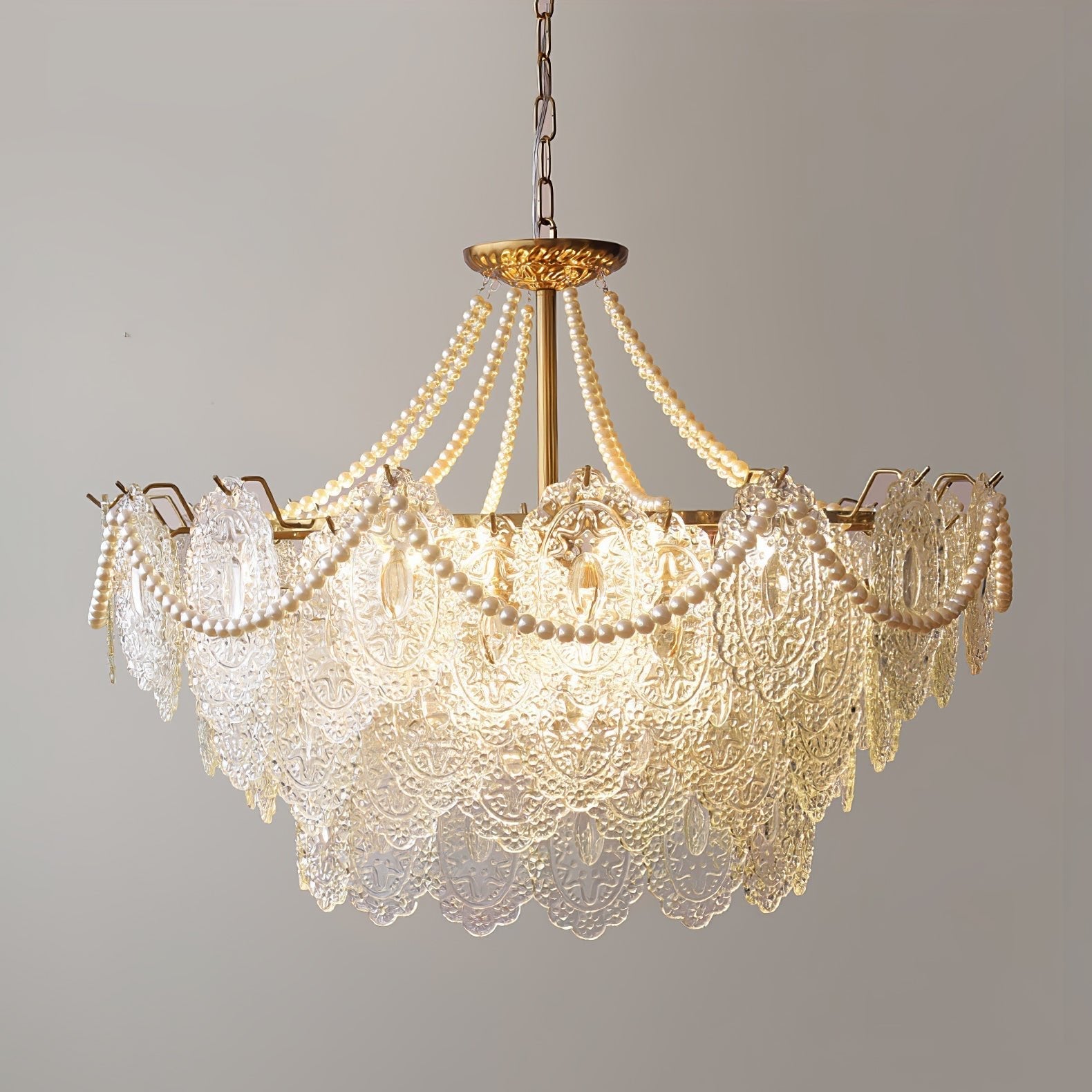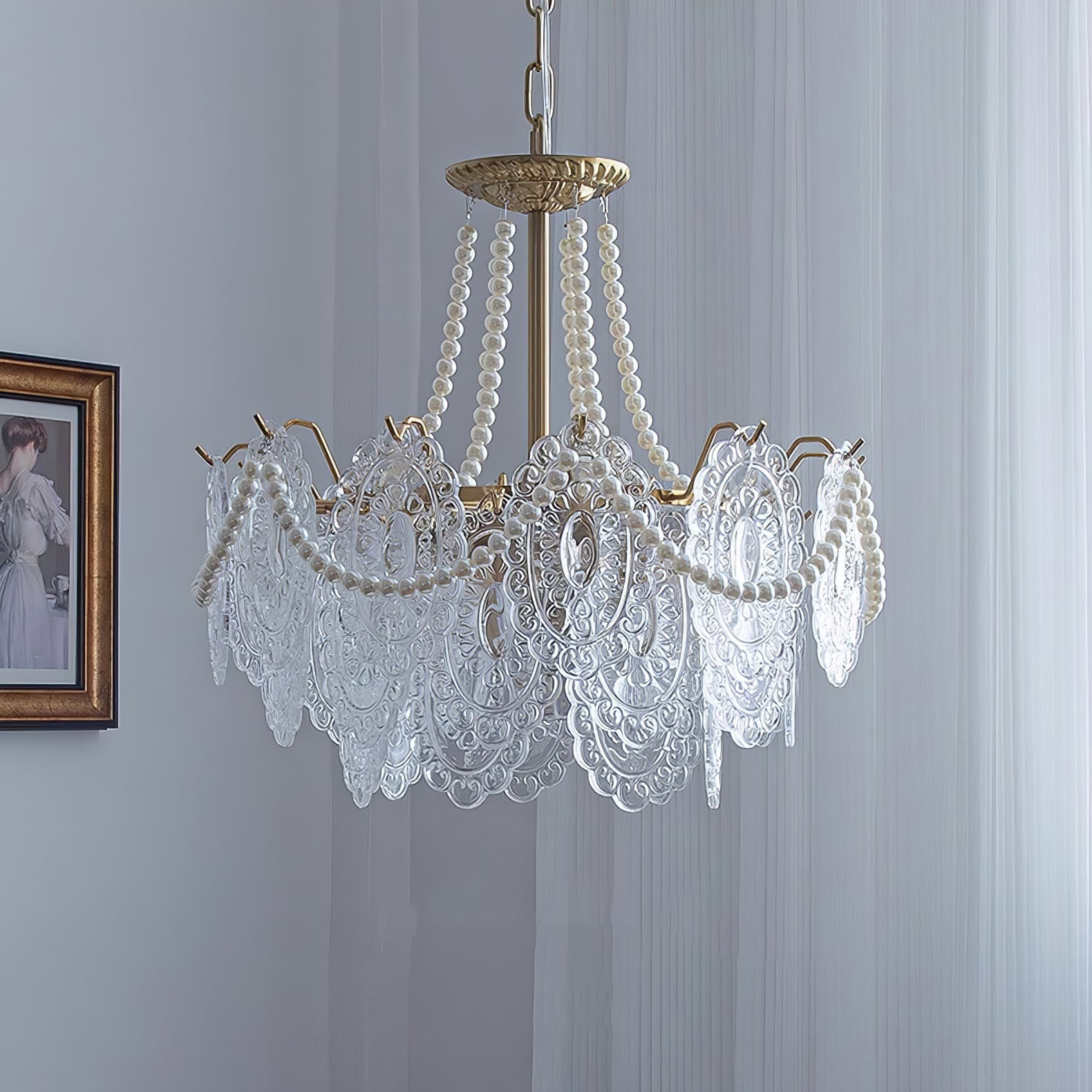 The Pearls Glass Chandelier combines golden metal with intricate pearl-like crystals, creating a modern yet elegant look. This stunning chandelier features a transparent finish that maintains vibrant colors and delivers ample light, perfect for adding a starry ambiance to any room.