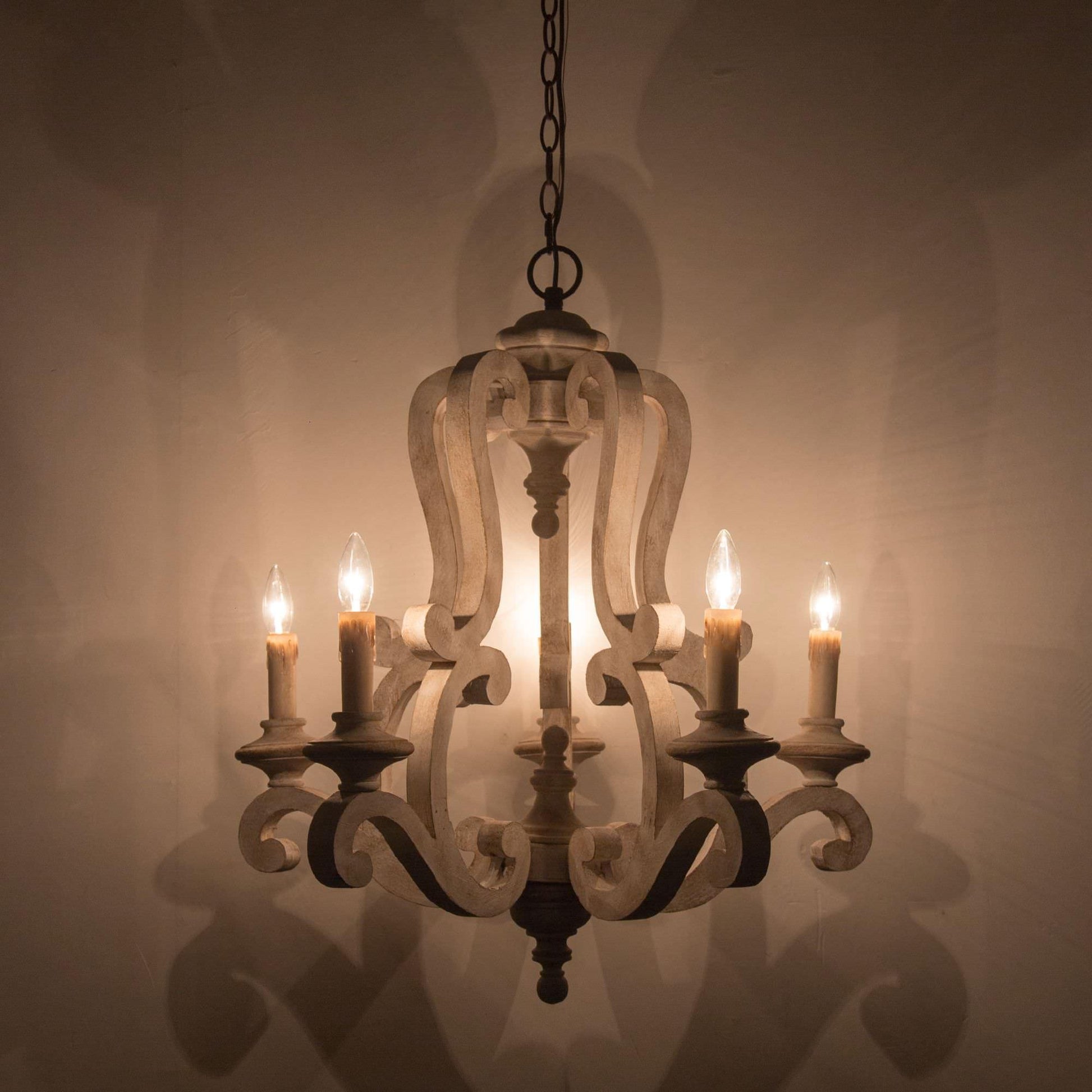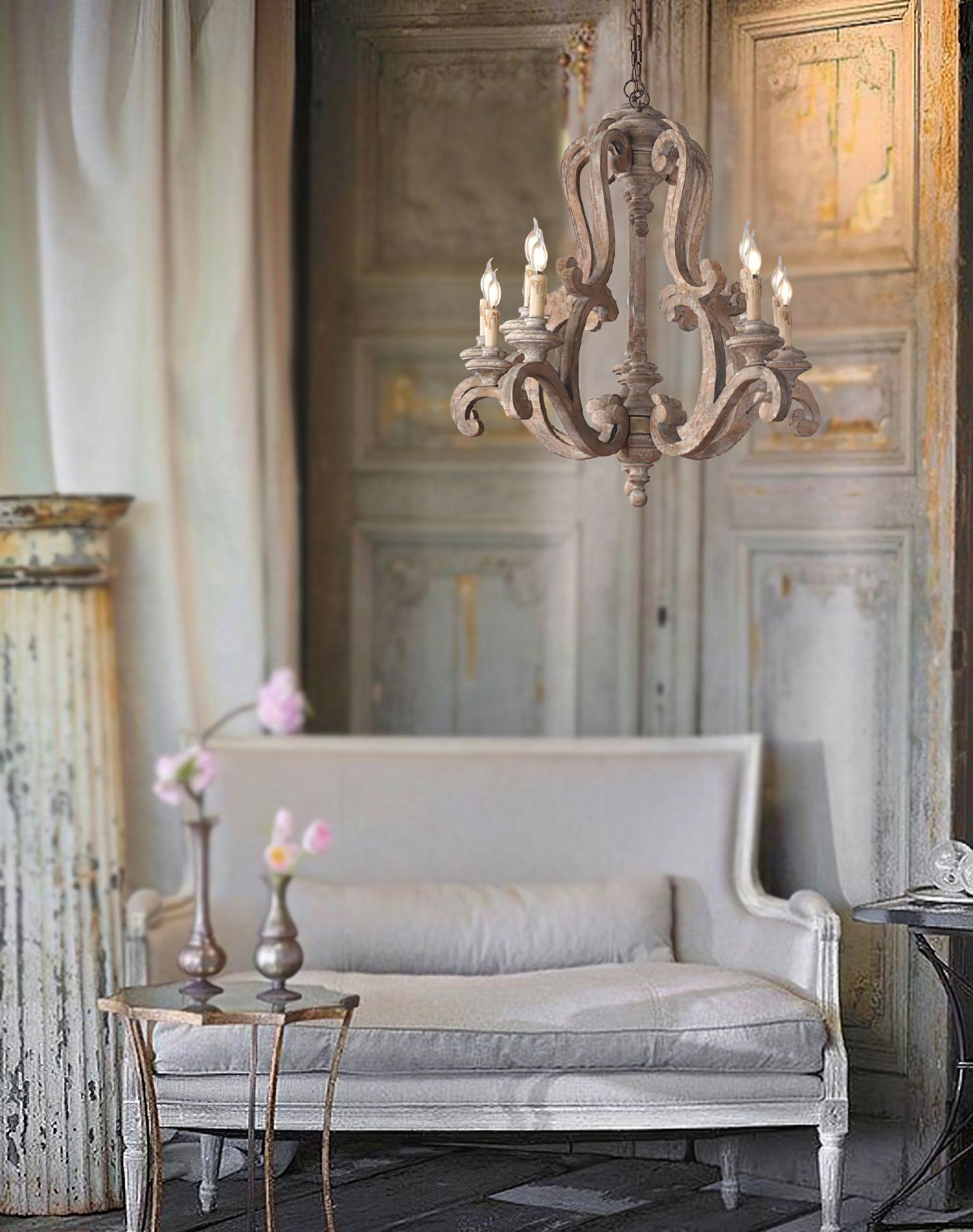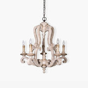 The Wooden Candle Chandelier brings a charming cottage vibe to your home. Featuring a distressed antique white wood finish and a candelabra base with four candle-style lights, it illuminates your dining room or foyer with timeless elegance.