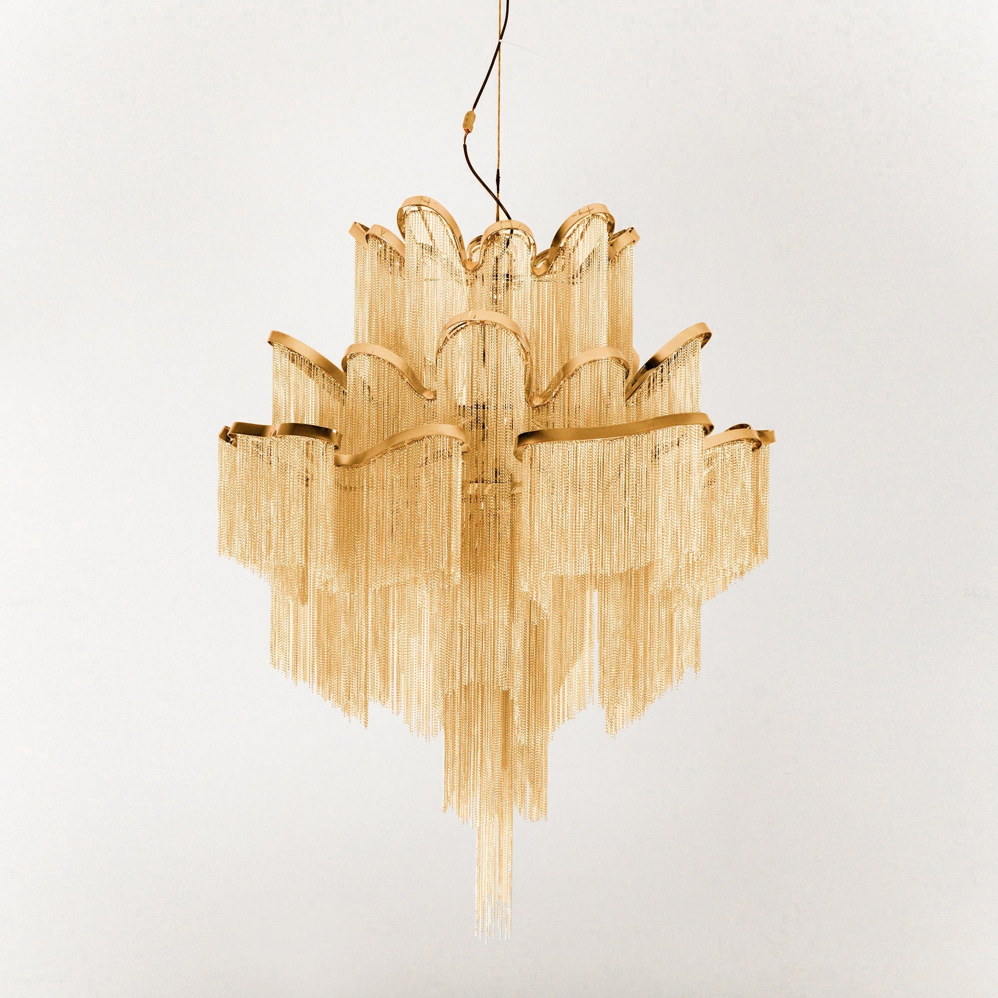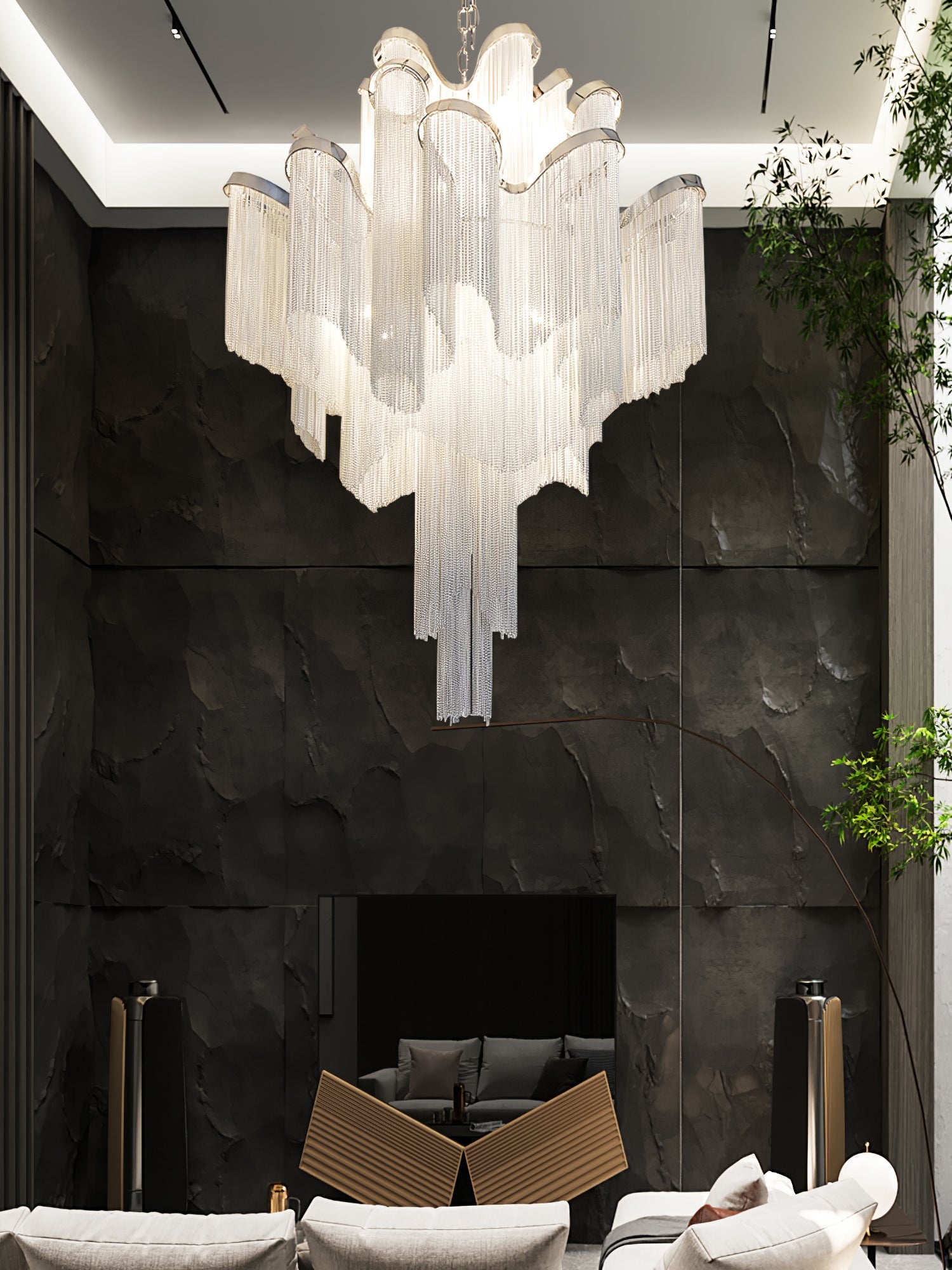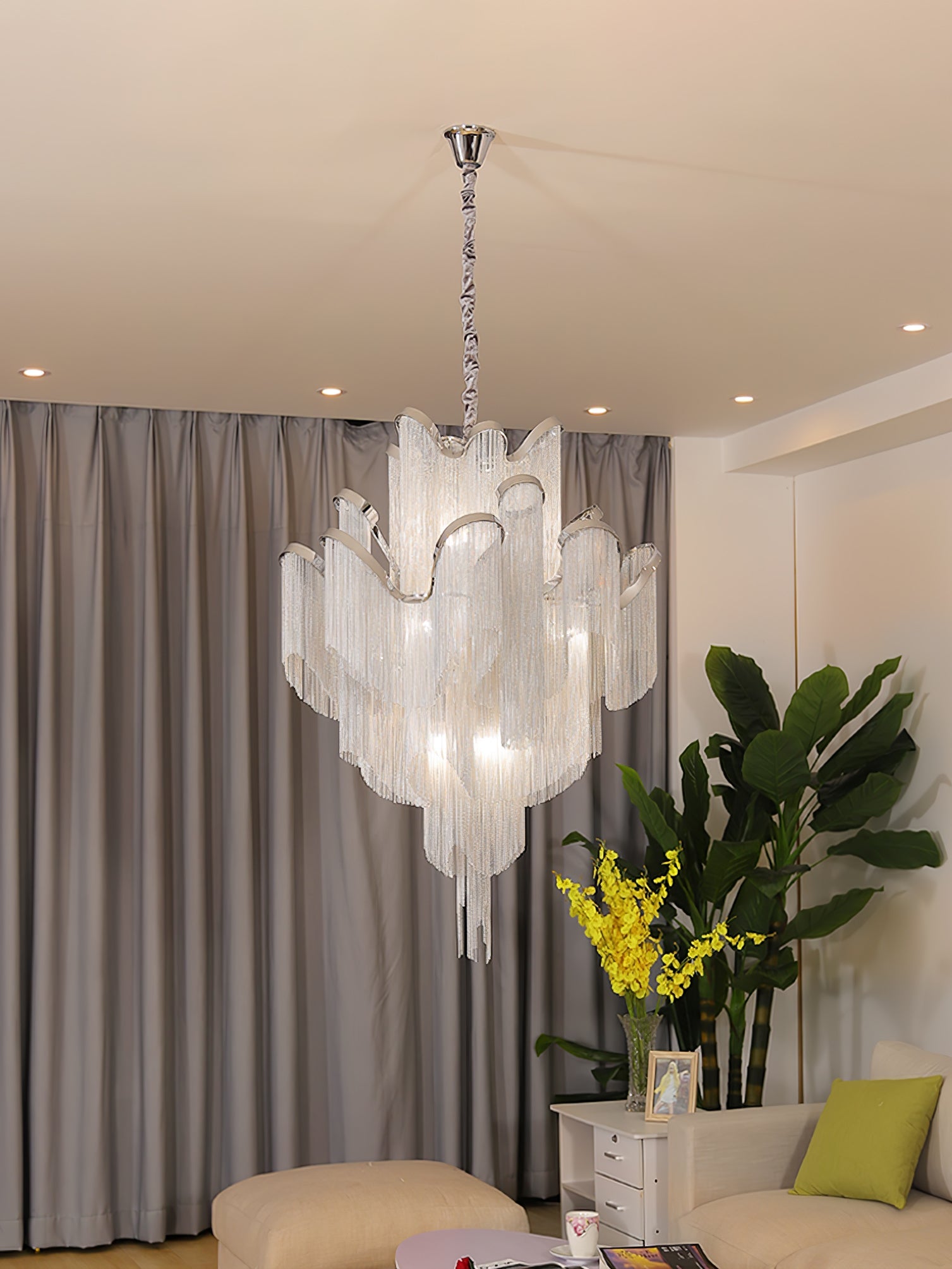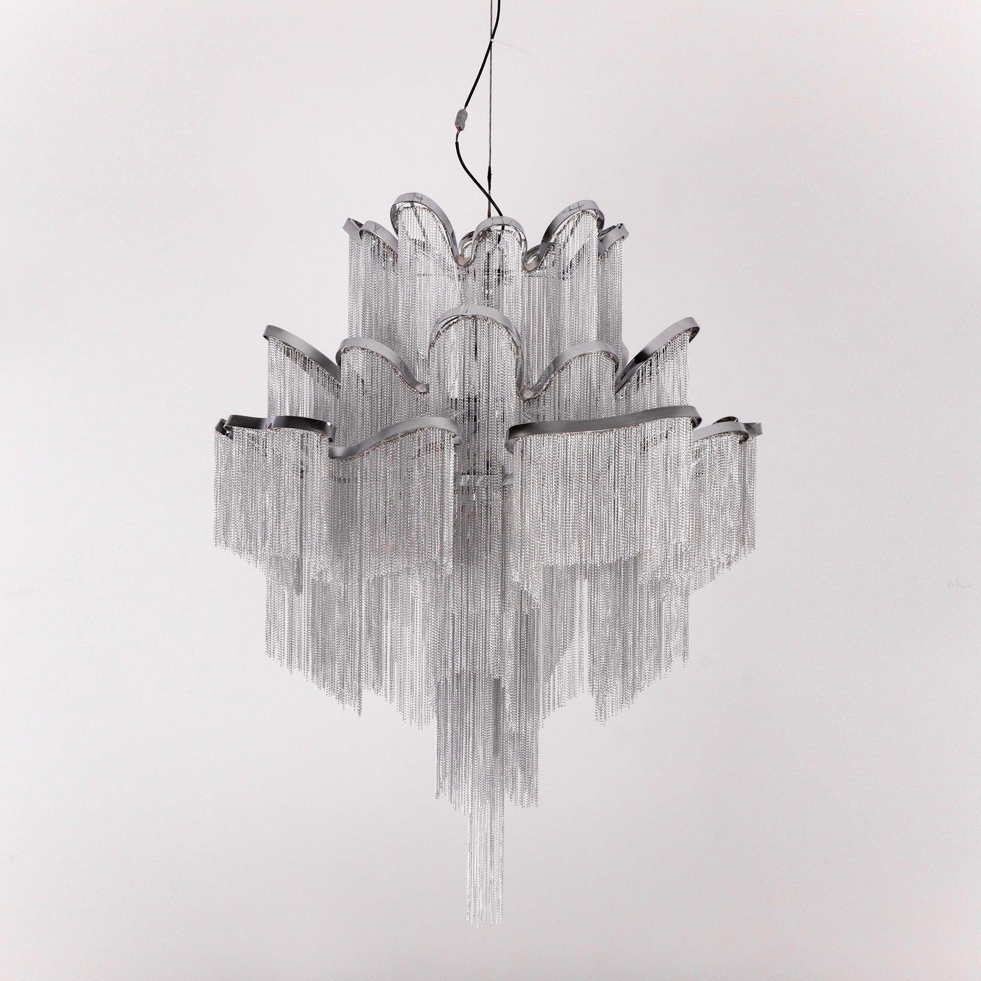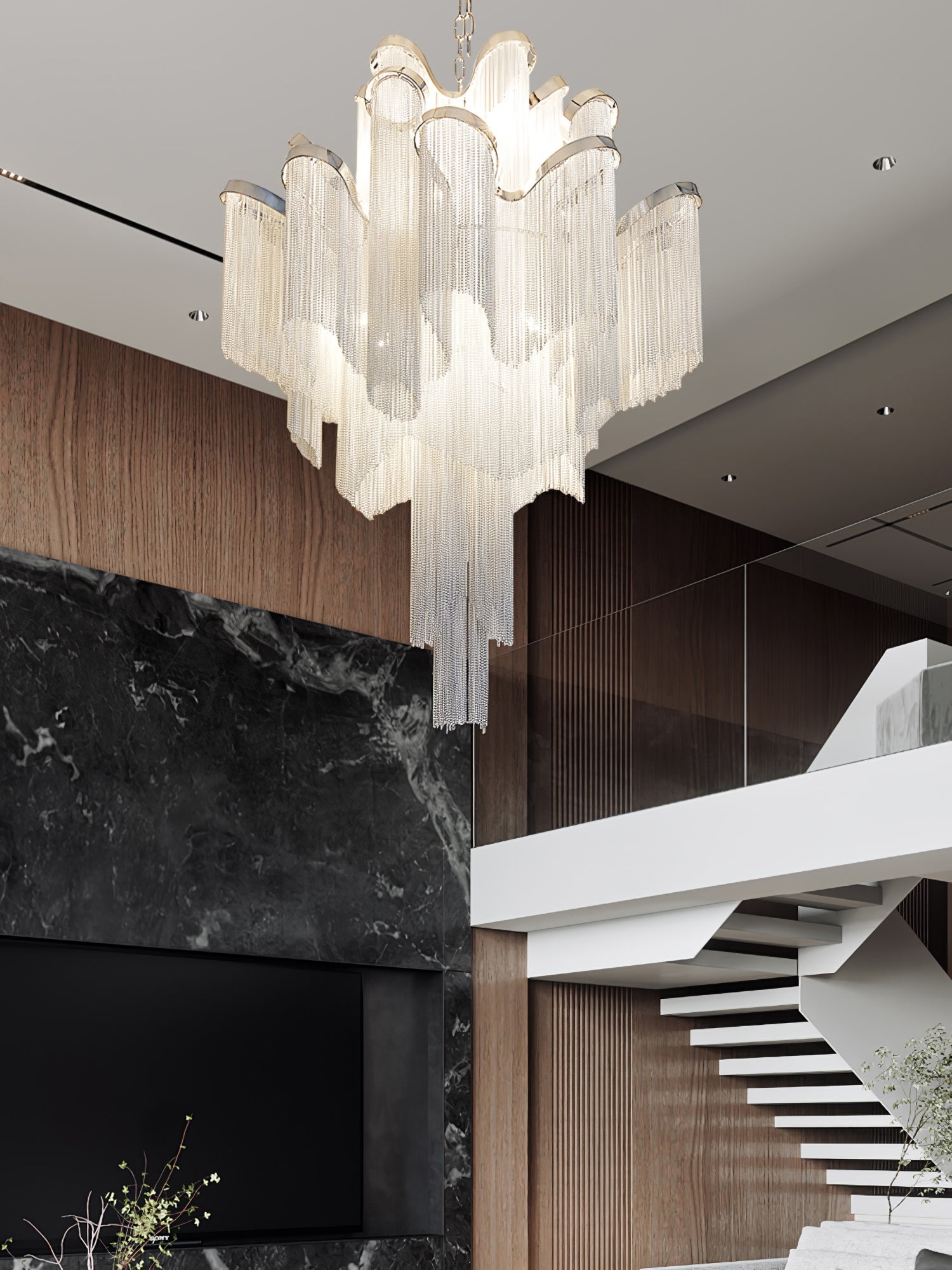 The Stream Chain Chandelier features cascading layers of metal chain flowing down a nickel-plated frame. This stunning design creates a unique, immersive light effect, casting striped and serene shadows throughout the room. Perfect for any space that needs a touch of elegance and sophistication.