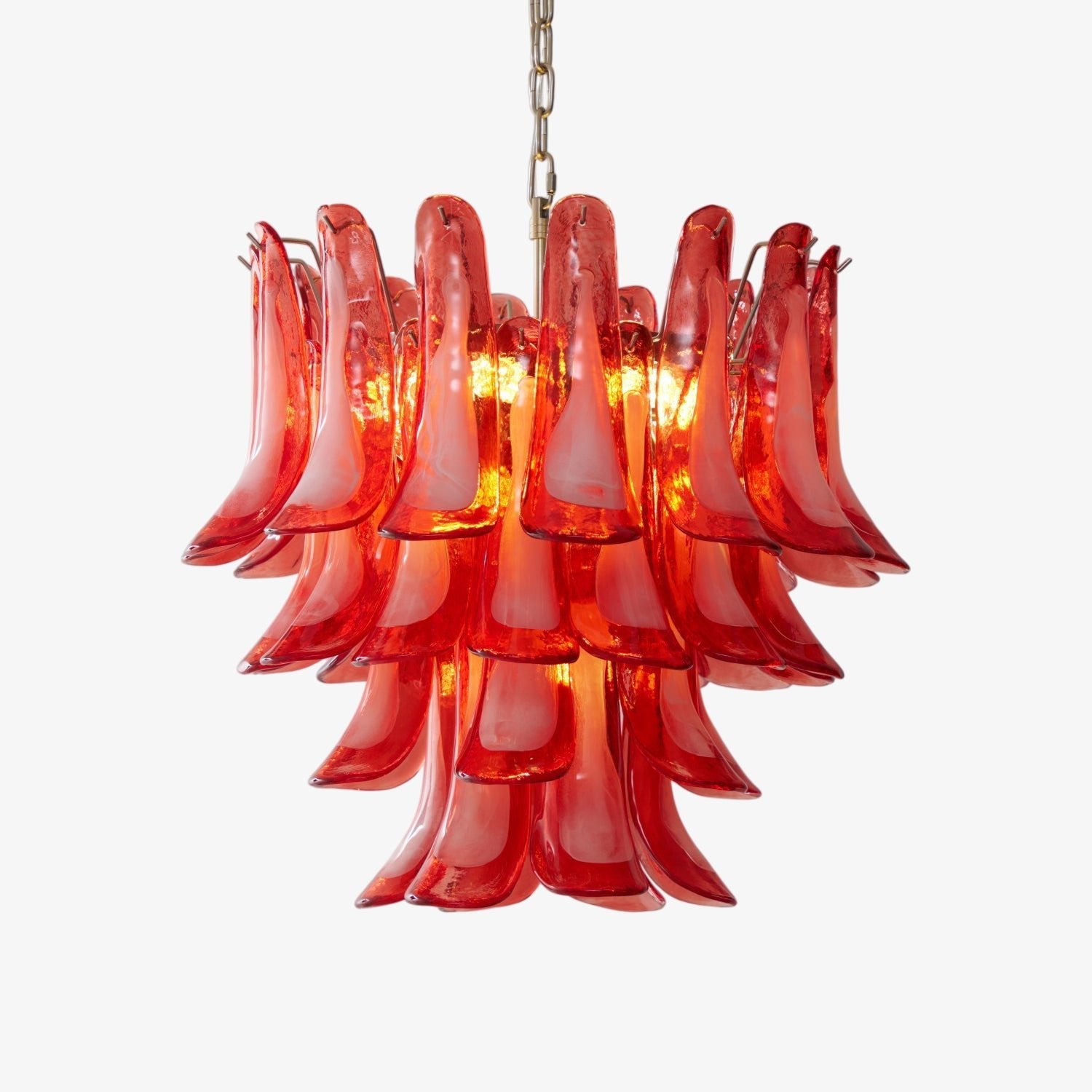 Featuring hand-blown crimson Murano glass petals in layered tiers, this chandelier casts a rich, inviting glow that elevates any interior. Ideal for entryways, dining rooms, or luxurious living spaces, it blends vintage Italian artistry with modern sophistication for a truly unforgettable centerpiece.