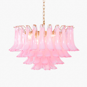 This chandelier features layered pink glass leaves with translucent edges, creating a blooming floral silhouette and a soft, radiant glow. Handcrafted for refined elegance, it’s an eye-catching centerpiece for dining rooms or lounges. The tiered structure combines vintage glamour with modern charm, making it perfect for sophisticated interiors.