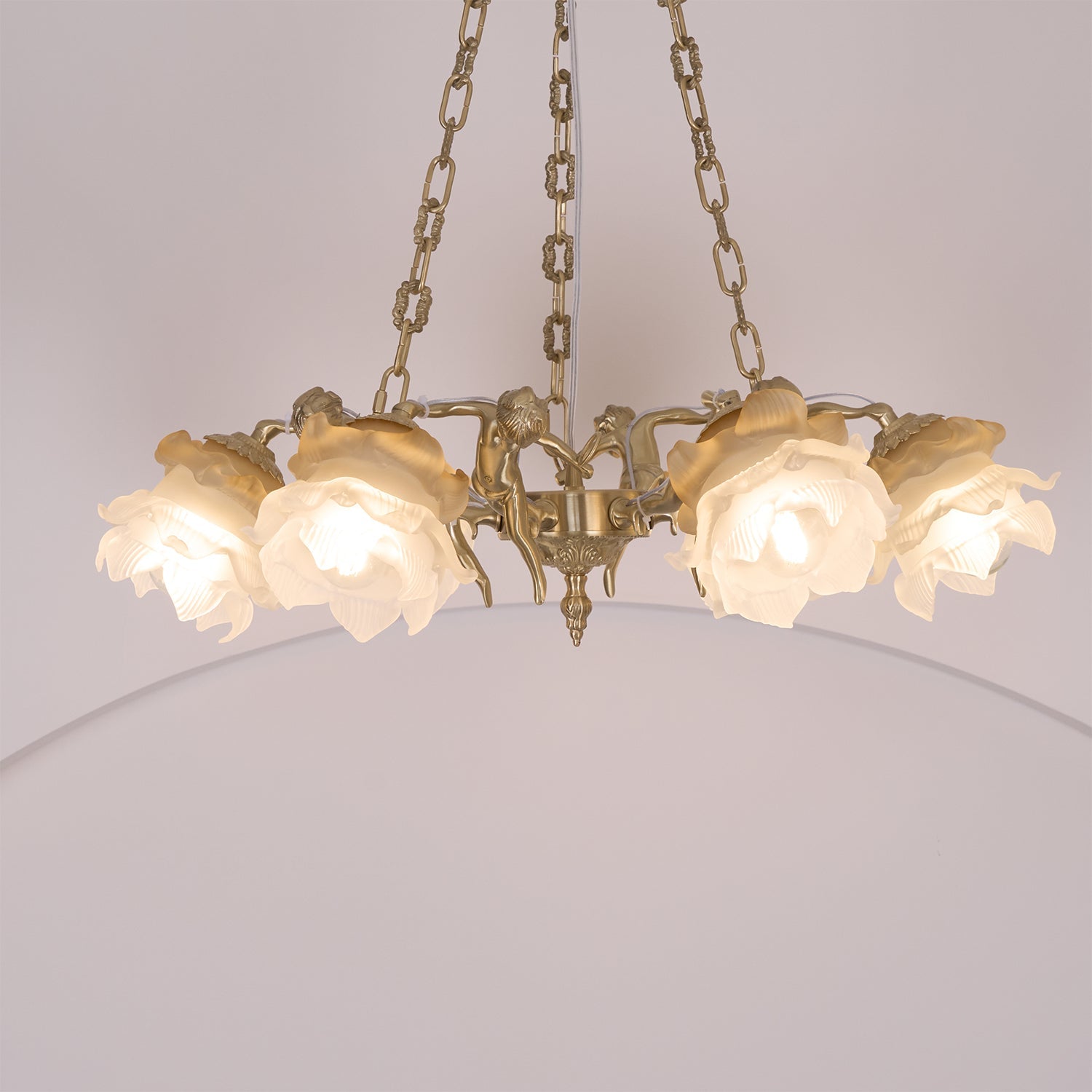 Stunningly beautiful, this new Italian Aged Brass Pendant brings fine craftsmanship and elegance to your home. The three statuettes hanging from this piece are beautifully rendered in real brass, accenting an already elegant fixture. Putti, or cupids, were angels of fertility and love in Renaissance art. This chandelier gives you the perfect amount of elegance to light up any room.