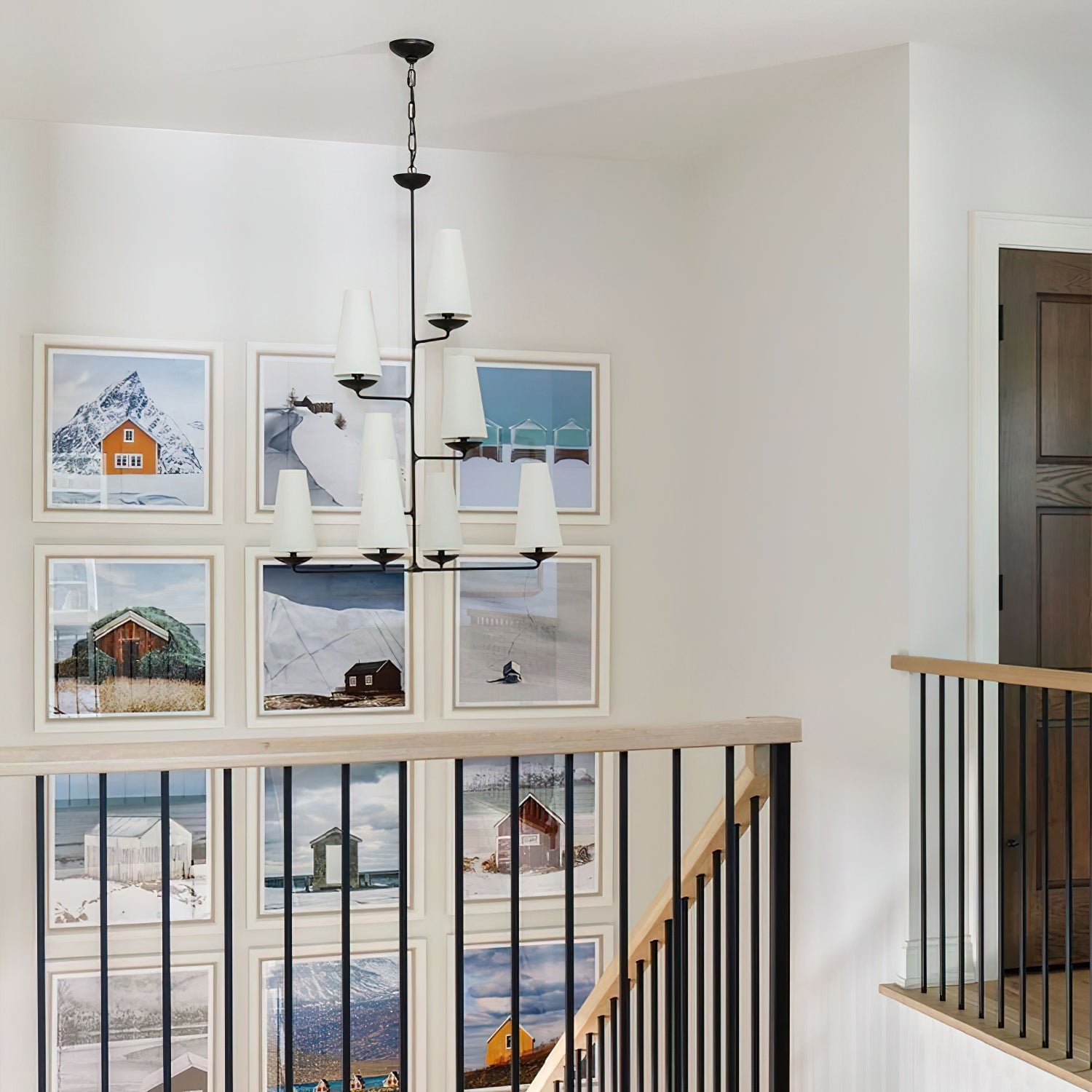 Suspended from a layered copper frame, this chandelier features linen lampshades that add elegance and movement to any space. Its unique form makes it a perfect statement piece for modern living rooms or dining areas.