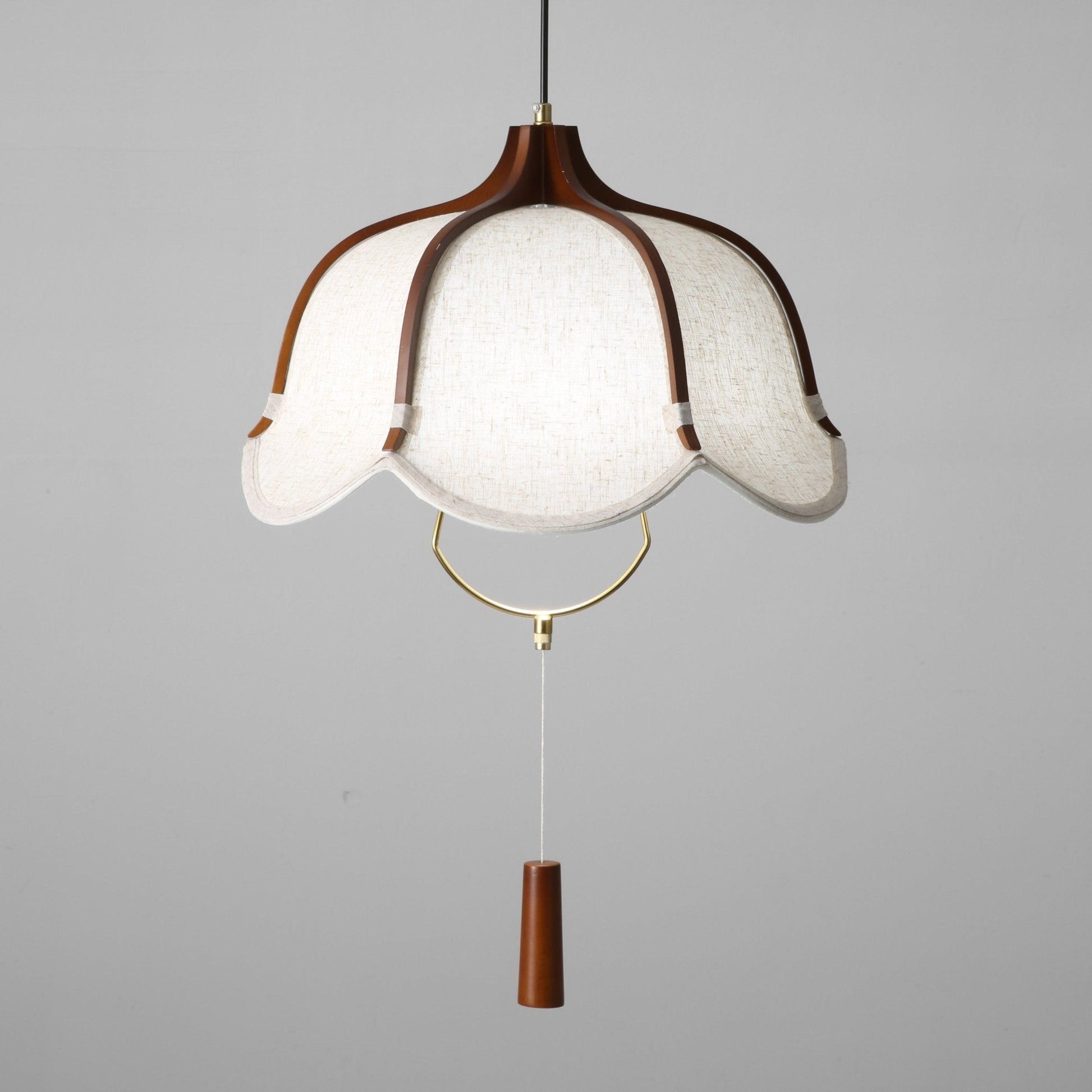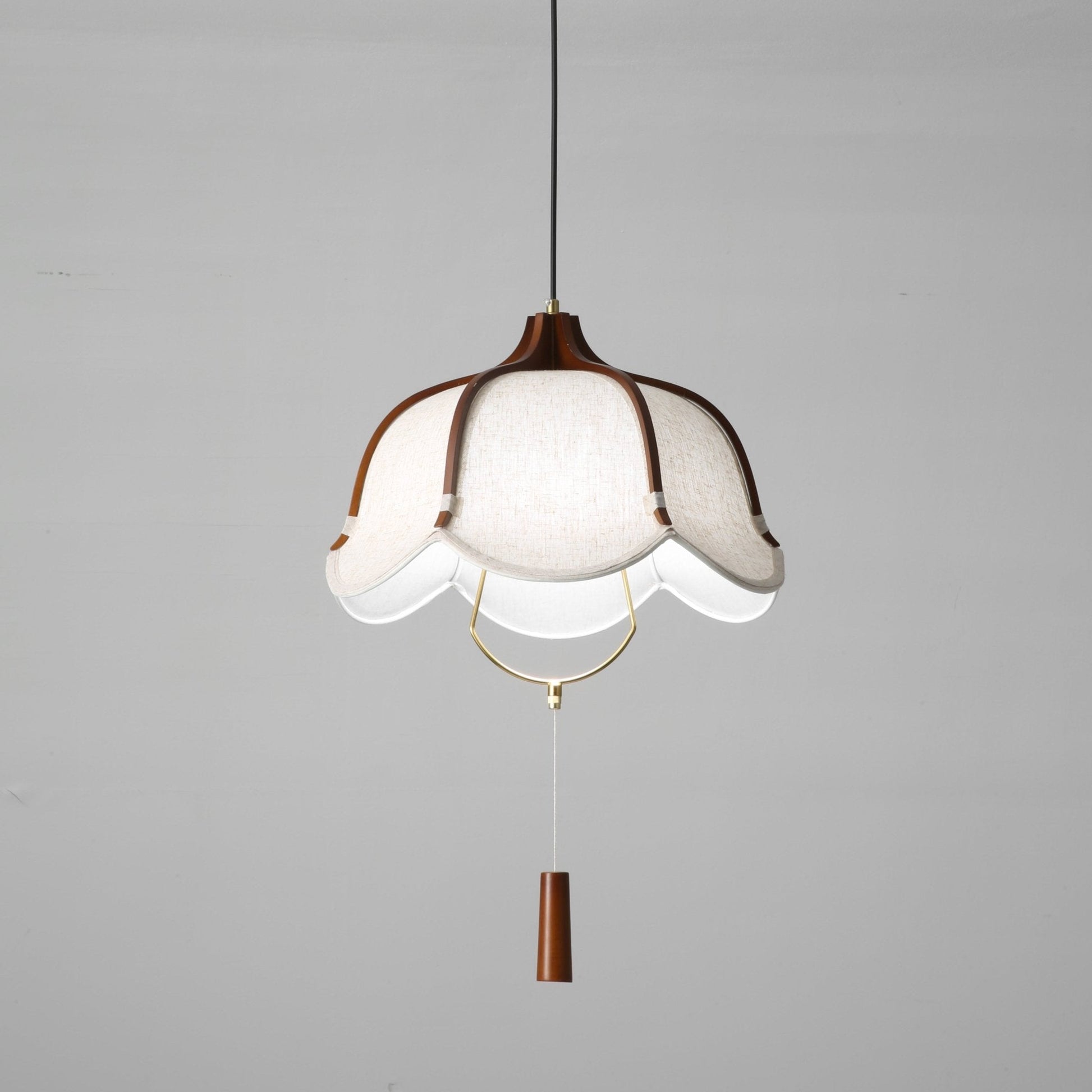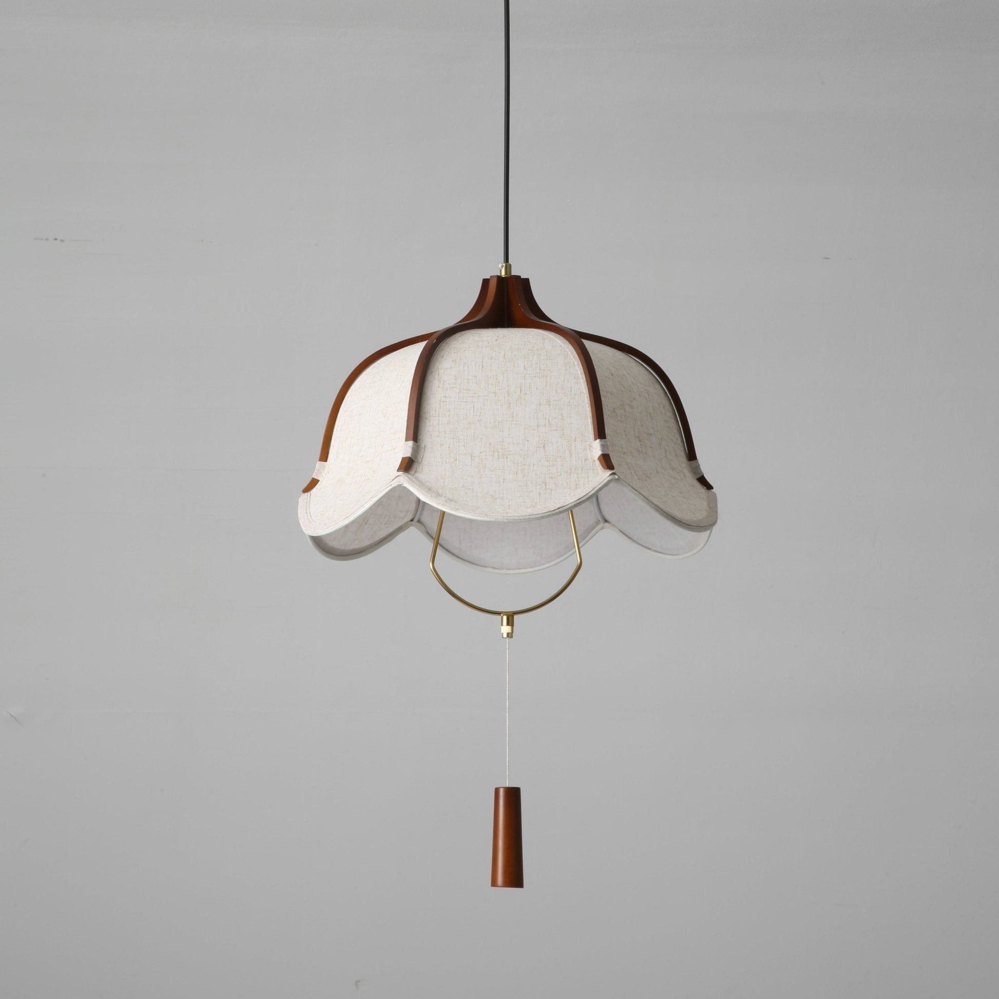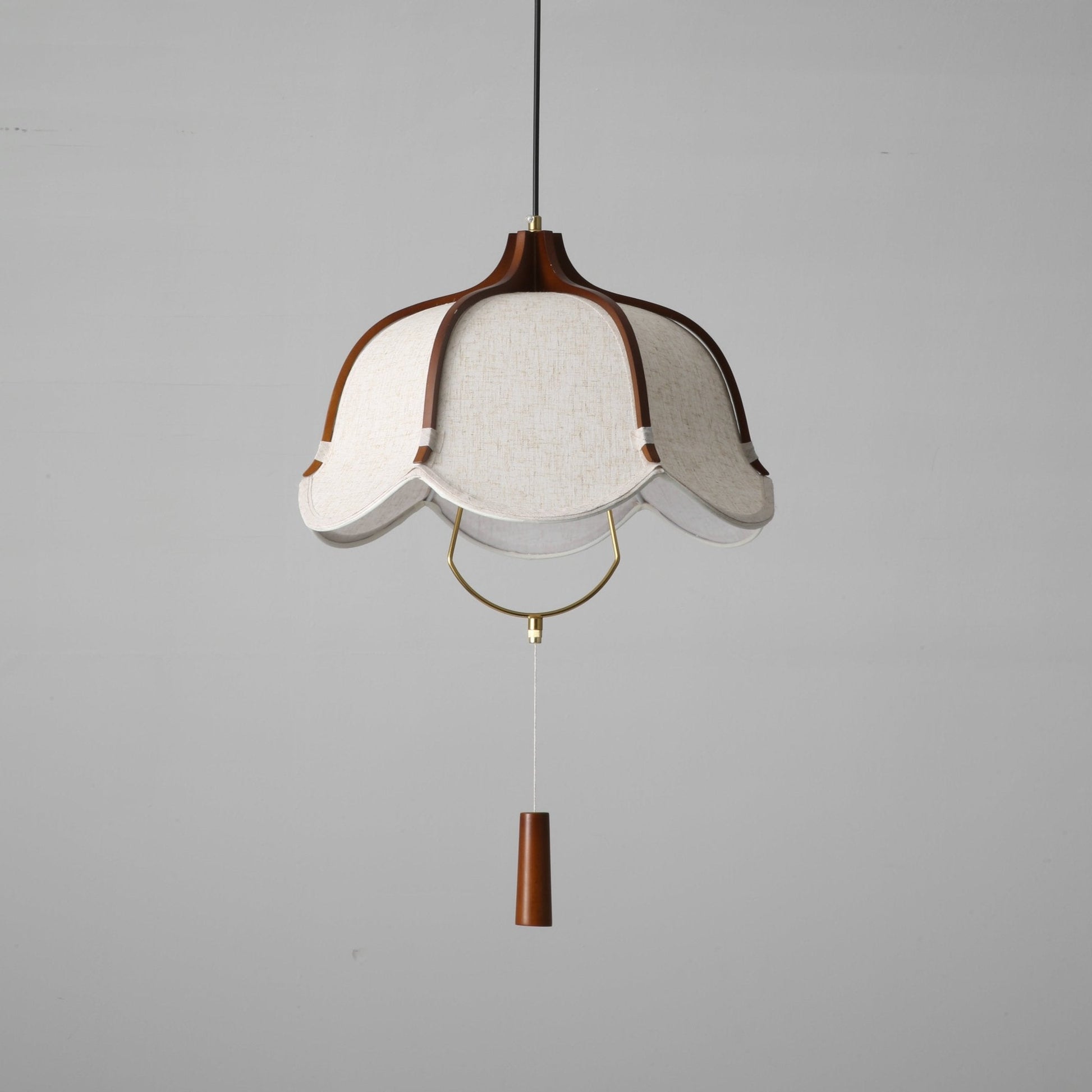 The Pendant Lamp features a delicate scalloped fabric shade and rich wood accents, adding a warm, nostalgic glow to any space. Perfect for dining rooms, living areas, or cozy nooks, this elegant chandelier enhances the ambiance and elevates the style of any room.